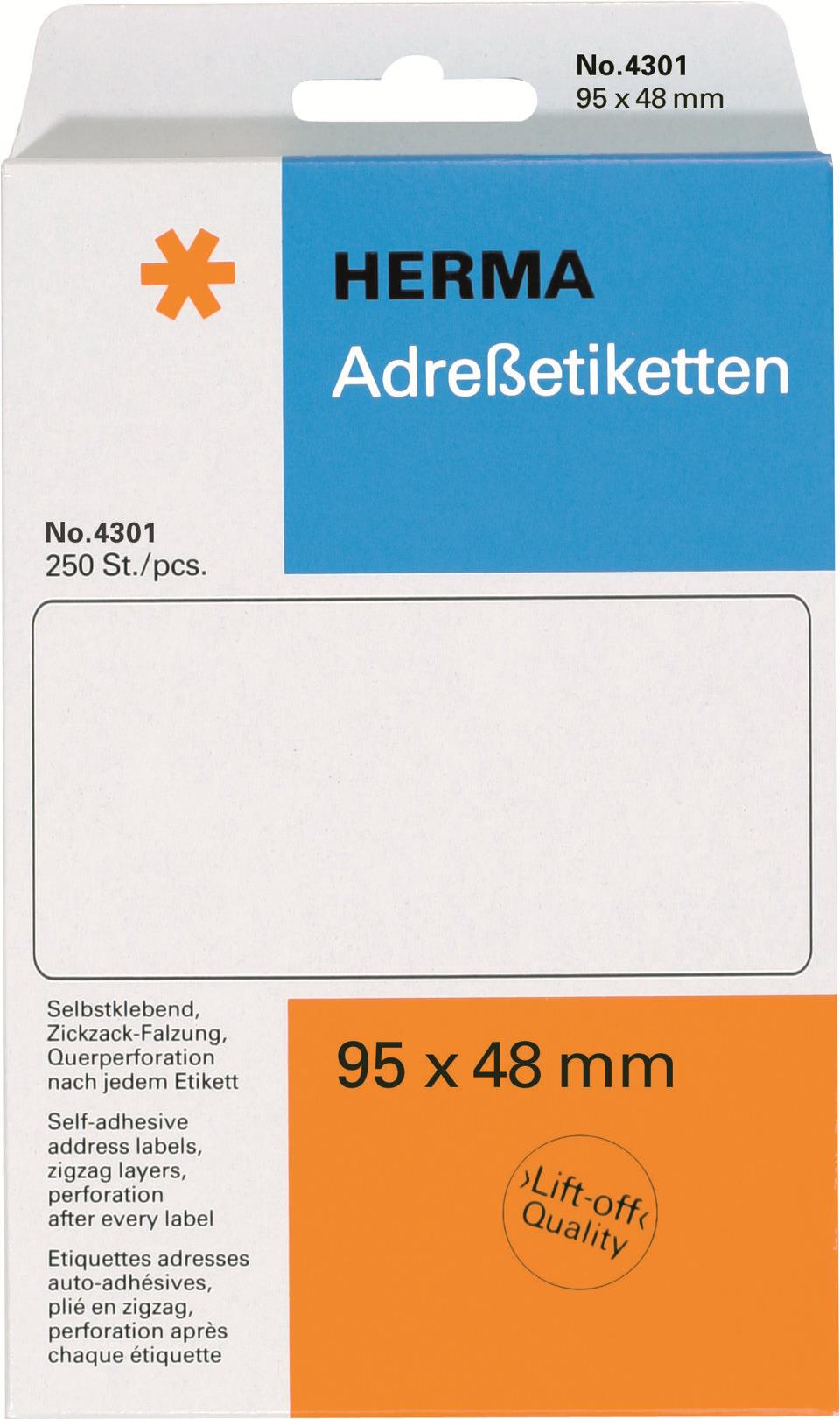 HERMA - Leporellogefaltete, perforierte Endlosadressetiketten - weiß - 95 x 48 mm - 250 Stck. (4301)