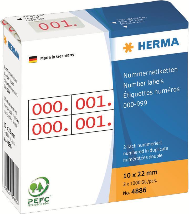 HERMA - Selbstklebende Nummernetiketten - Rot - 10 x 22 mm - 2000 Etikett(en) (1000 Bogen x 2) (4886)