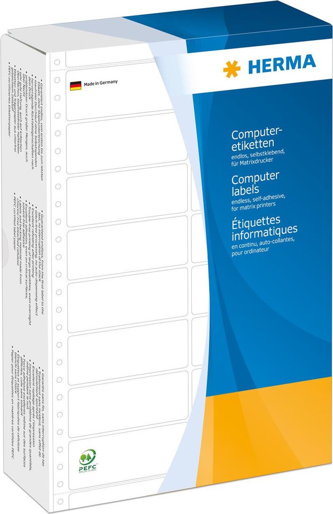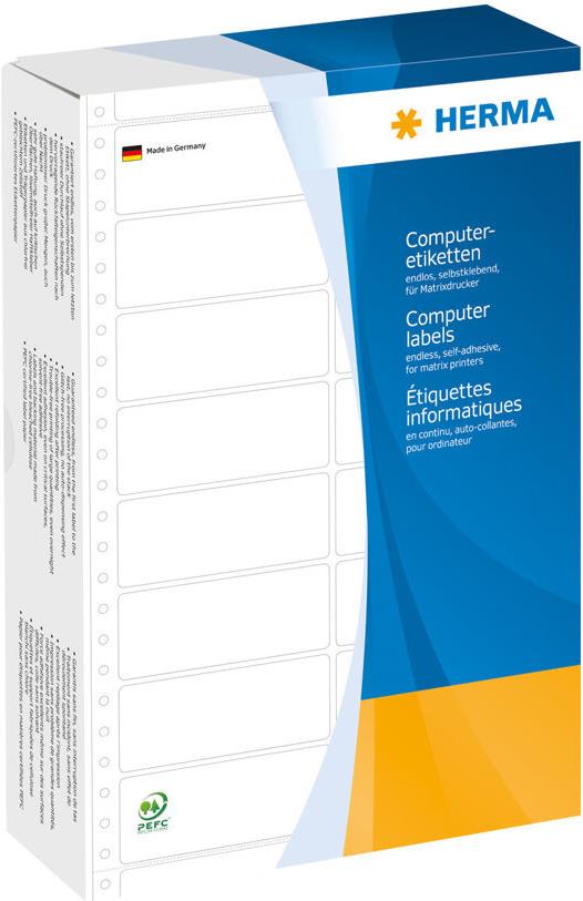 Computeretiketten endlos, mit Führungslochrand. In bester Qualität: garantiert endlos, ohne Stapelunterbrechung. Störungsfreier Lauf, optimales Ablageverhalten und perfekte Druckergebnisse. Aus hochwertigem, holzfreiem Schreibpapier, chlorfrei gebleicht, lösemittelfreier Haftkleber. Weiße Etiketten mit PEFC-Zertifikat. Sehr gute Haftung, auch auf kritischen Oberflächen.