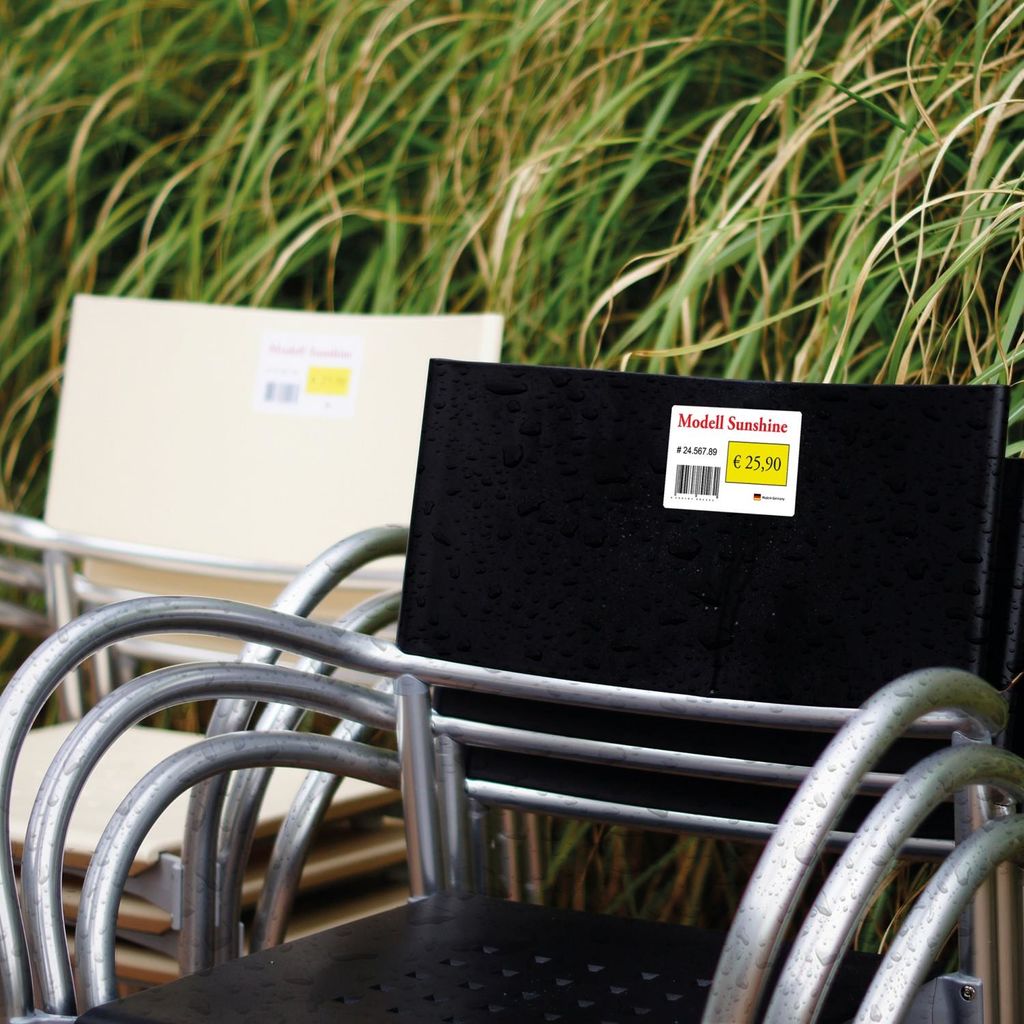 - Ideal für temporäre Auszeichnungen, stark beanspruchte Etikettierungen und im Außenbereich: für Produktauszeichnungen, als Eigentumsetiketten, Schaufensteraufkleber, Hinweis- und Warnschilder, für wechselnde Informationen in Lager und Produktion