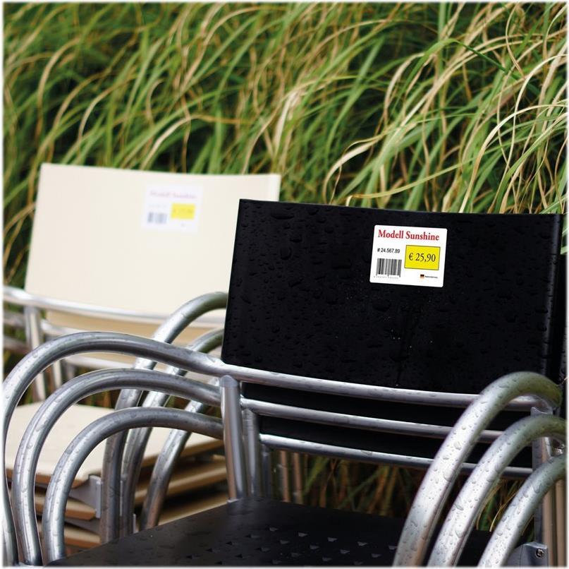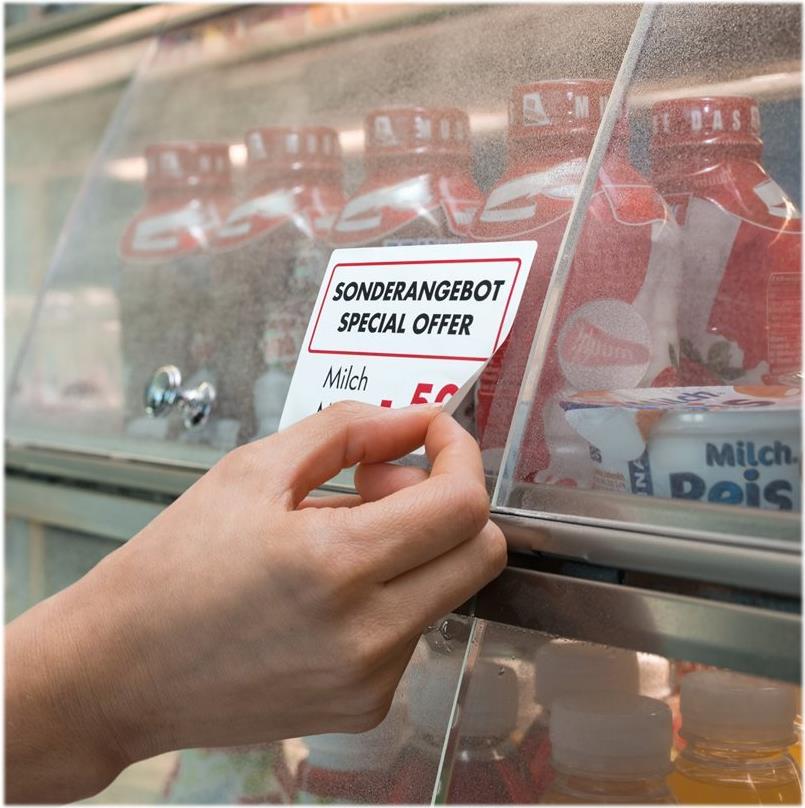 - Ideal für temporäre Auszeichnungen, stark beanspruchte Etikettierungen und im Außenbereich: für Produktauszeichnungen, als Eigentumsetiketten, Schaufensteraufkleber, Hinweis- und Warnschilder, für wechselnde Informationen in Lager und Produktion