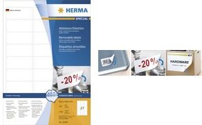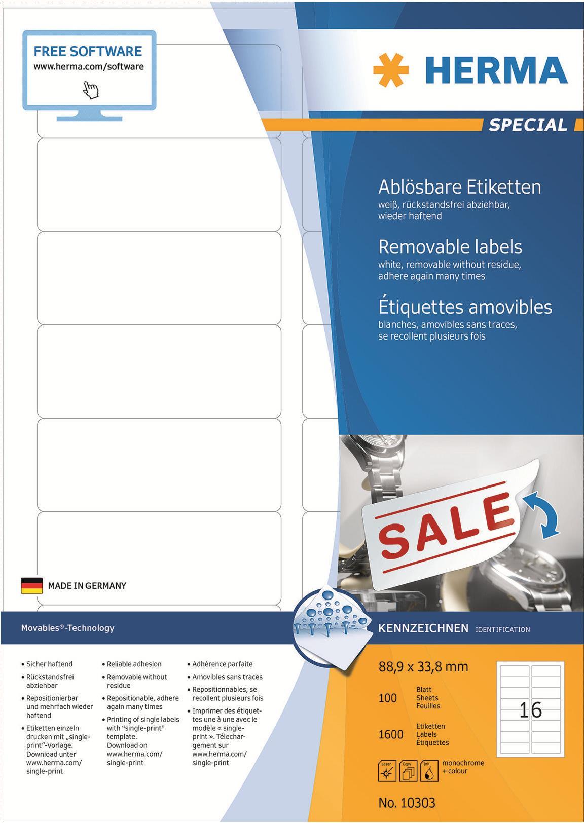 Selbstklebende Etiketten auf A4-Blättern. Mit Movables -Technology: sicher haftend auf allen glatten, trockenen, unbeschädigten und staubfreien Flächen, rückstandsfrei wieder abziehbar ohne den Untergrund zu beschädigen, problemlos repositionierbar und mehrfach wieder haftend. Ideal für zeitlich befristete oder wechselnde Kennzeichnungen und Oberflächen, die nicht beschädigt werden sollen. Sehr gute Druckergebnisse auf allen Laser- und Inkjetdruckern, Kopierern, Farblaserdruckern und Farbkopierern. Störungsfreie Verarbeitung durch Rundum-Sicherheitskante und optimale Planlage. Umweltfreundlich: FSC Mix Credit-zertifiziert, chlorfrei gebleicht, lösemittelfreier Haftkleber. Etiketten sind 100 % recyclingfähig mit dem Altpapier, Verpackung aus Recyclingkarton. Kostenlose Softwarelösungen: www.herma.de/software.