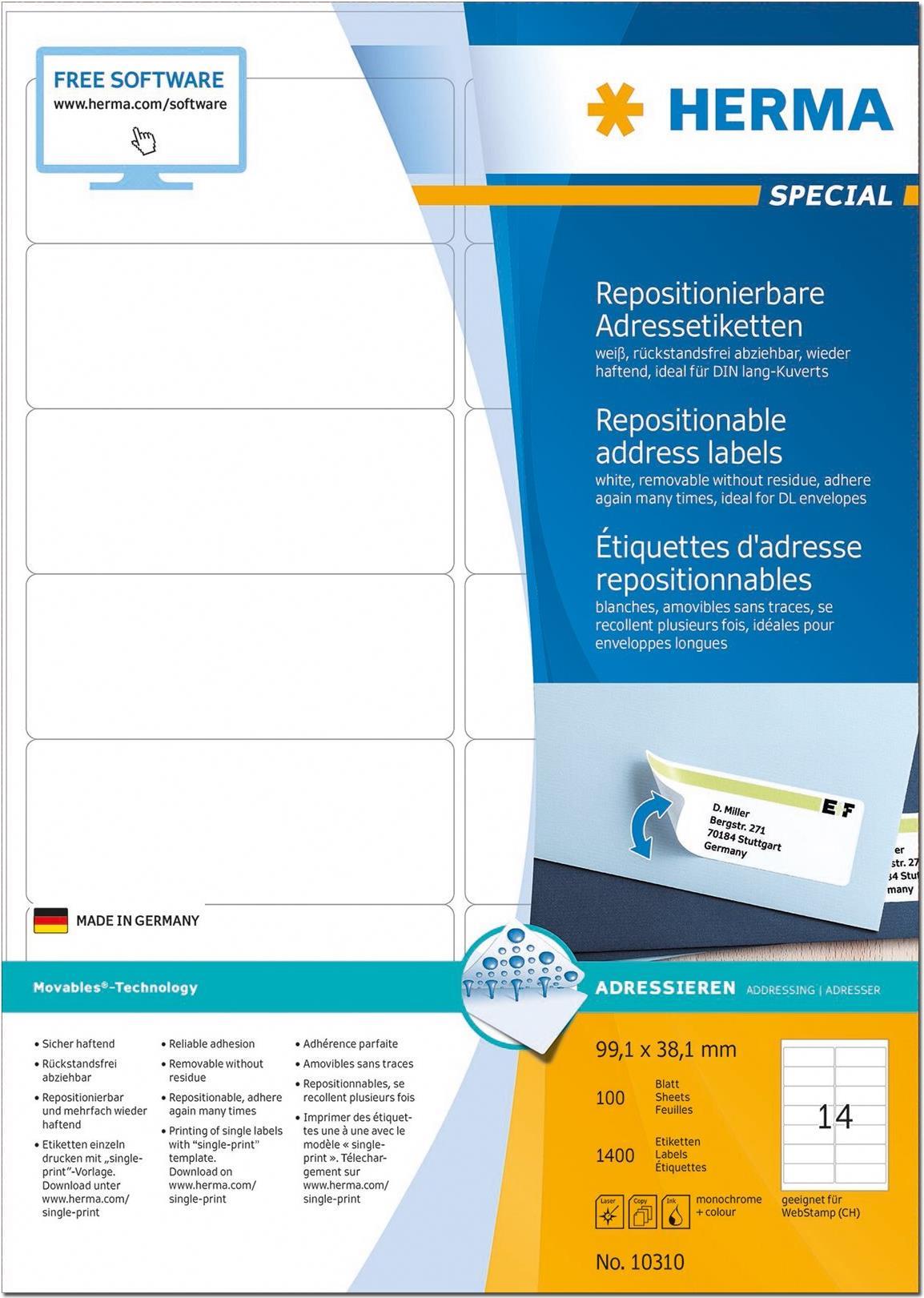 HERMA Movables - Selbstklebende Etiketten - weiß - 99,1 x 38,1 mm - 1400 Stck. (100 Bogen x 14) (10310)