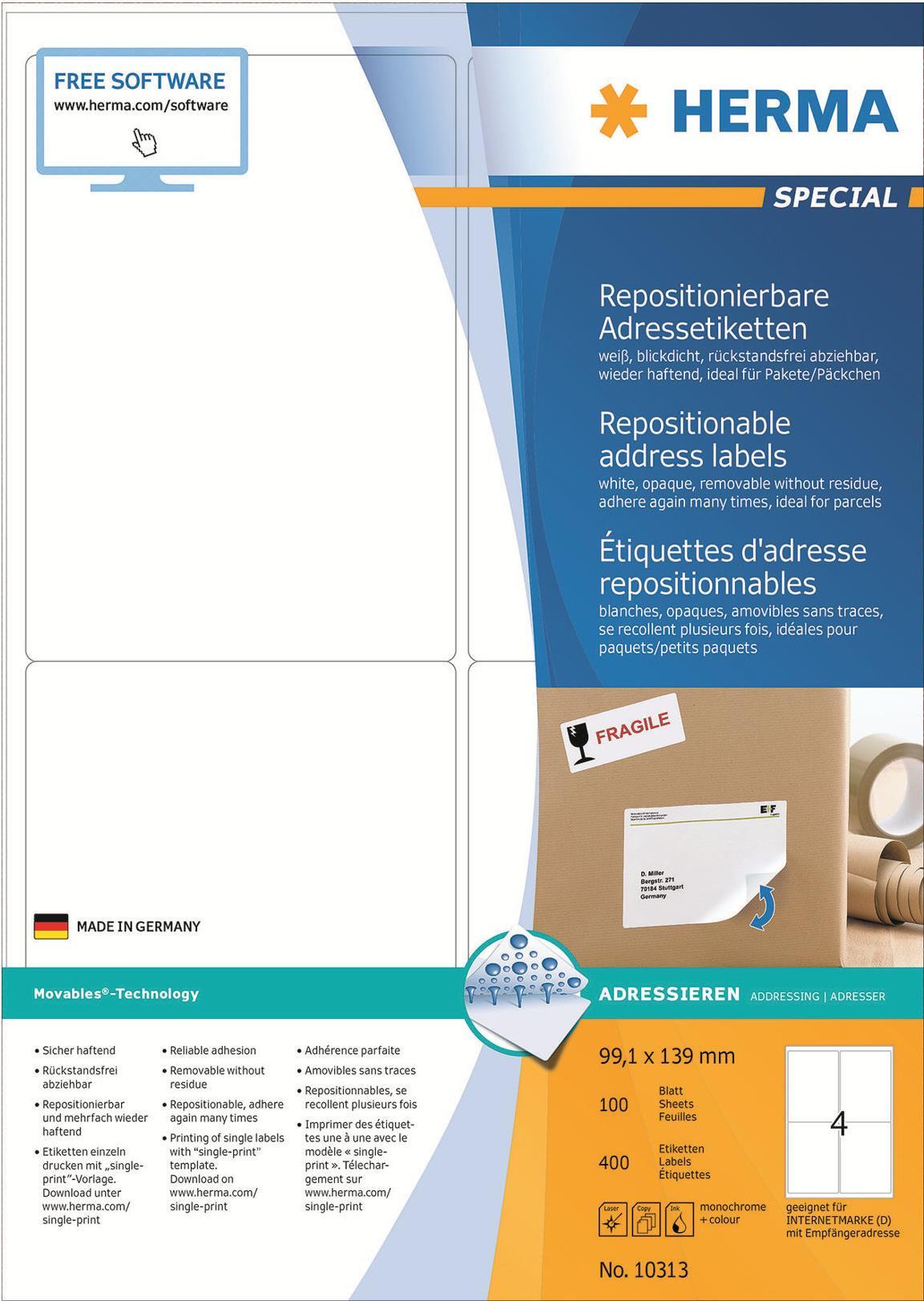 HERMA Movables - Selbstklebende Etiketten - weiß - 99,1 x 139 mm - 400 Stck. (100 Bogen x 4) (10313)