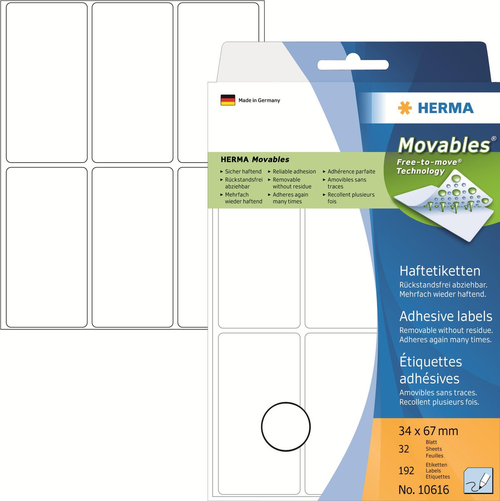 HERMA Movables - Selbstklebende Etiketten - weiß - 34 x 67 mm 192 Stck. (32 Bogen x 6) (10616)
