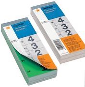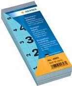 Nummernblock selbstklebend, aus Schreibpapier. Etikettenformat 28 x 56 mm zweigeteilt, Aufdruck von zwei identischen Nummern in Schwarz. Fortlaufend nummeriert von 1-500, jeweils 5 Doppelnummern pro Blatt. Blocks à 100 Blatt = 500 Doppelnummern.