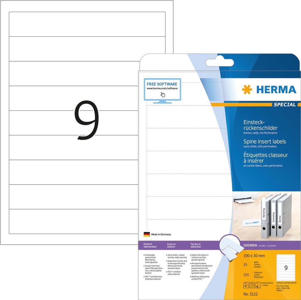 HERMA Special - Perforierte, nichtklebende, beschichtete Aktenetiketten aus Karton - weiß - 30 x 190 mm 225 Etikett(en) (25 Bogen x 9) (5122)
