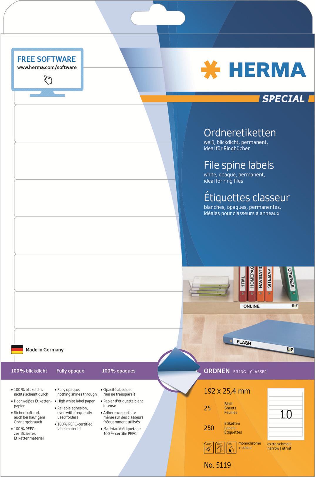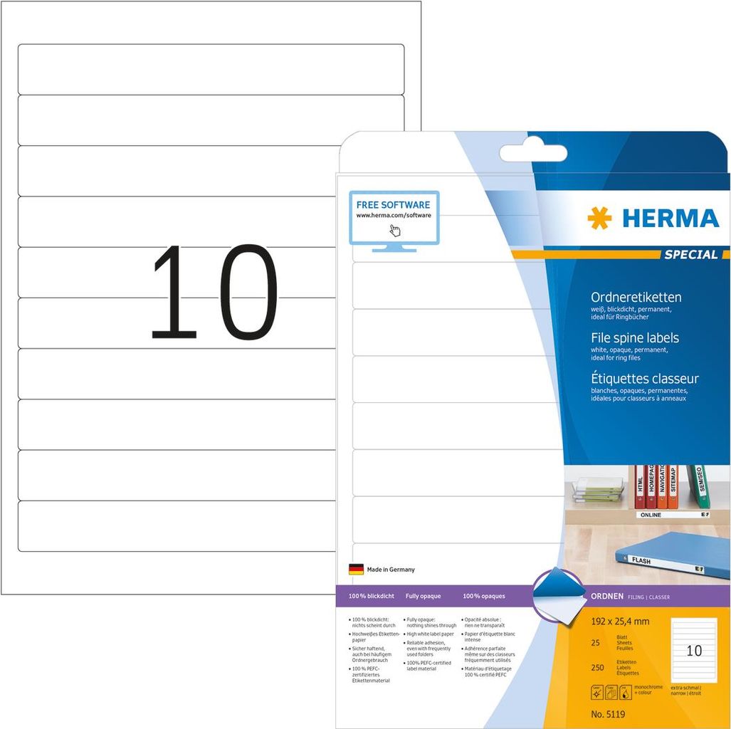 Ordneretiketten auf A4-Blättern, selbstklebend. Für ein einheitliches Erscheinungsbild im Büro und Zuhause. Für alle gängigen Ordner geeignet. Absolut blickdichtes Material mit hohem Weißgrad, alte Ordnerbeschriftungen scheinen nicht durch. Blanko: Ideal für Firmenlogo, Beschriftungen und Ordnungsvermerke. Sicher haftend, auch bei häufigem Ordnergebrauch. Umweltfreundlich: hochwertiges, chlorfrei gebleichtes Spezialpapier, PEFC-zertifiziert, lösemittelfreier Haftkleber. Etiketten sind 100 % recyclingfähig mit dem Altpapier, Verpackung aus Recyclingkarton. Sehr gute Druckergebnisse auf allen Laser- und Inkjetdruckern, Kopierern, Farblaserdruckern und Farbkopierern. Störungsfreie Verarbeitung durch Rundum-Sicherheitskante und optimale Planlage. Kostenlose Softwarelösungen: www.herma.de/software.