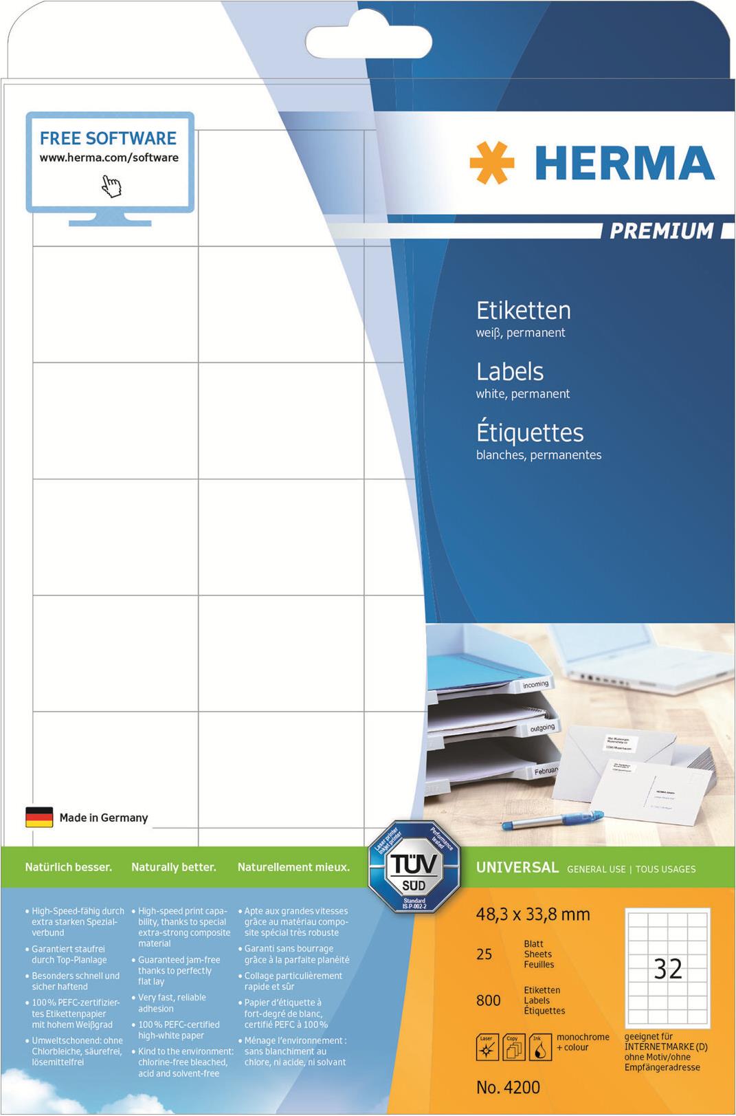 HERMA Premium - Permanent self-adhesive matte laminated paper labels - weiß - 48,3 x 33,8 mm - 800 Etikett(en) (25 Bogen x 32) (4200)