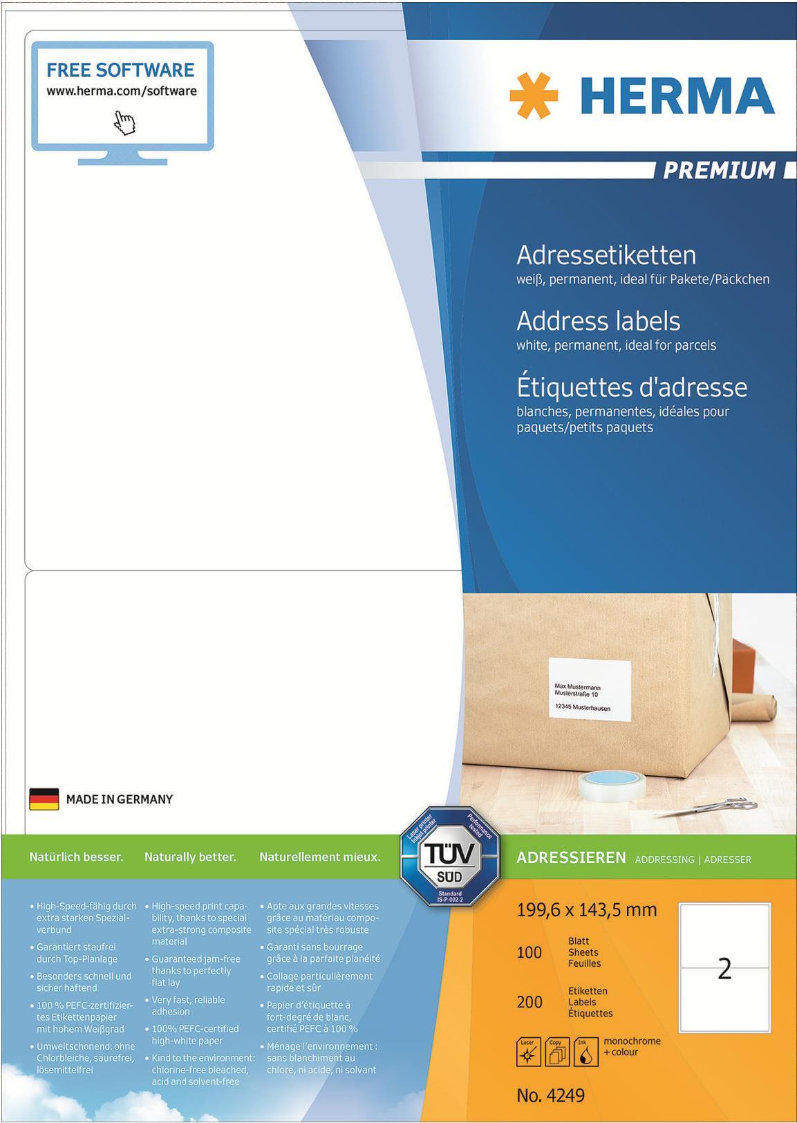 HERMA Premium - Permanent selbstklebende, matte laminierte Adressetiketten aus Papier - weiß - 199,6 x 143,5 mm - 200 Etikett(en) (100 Bogen x 2) (4249)