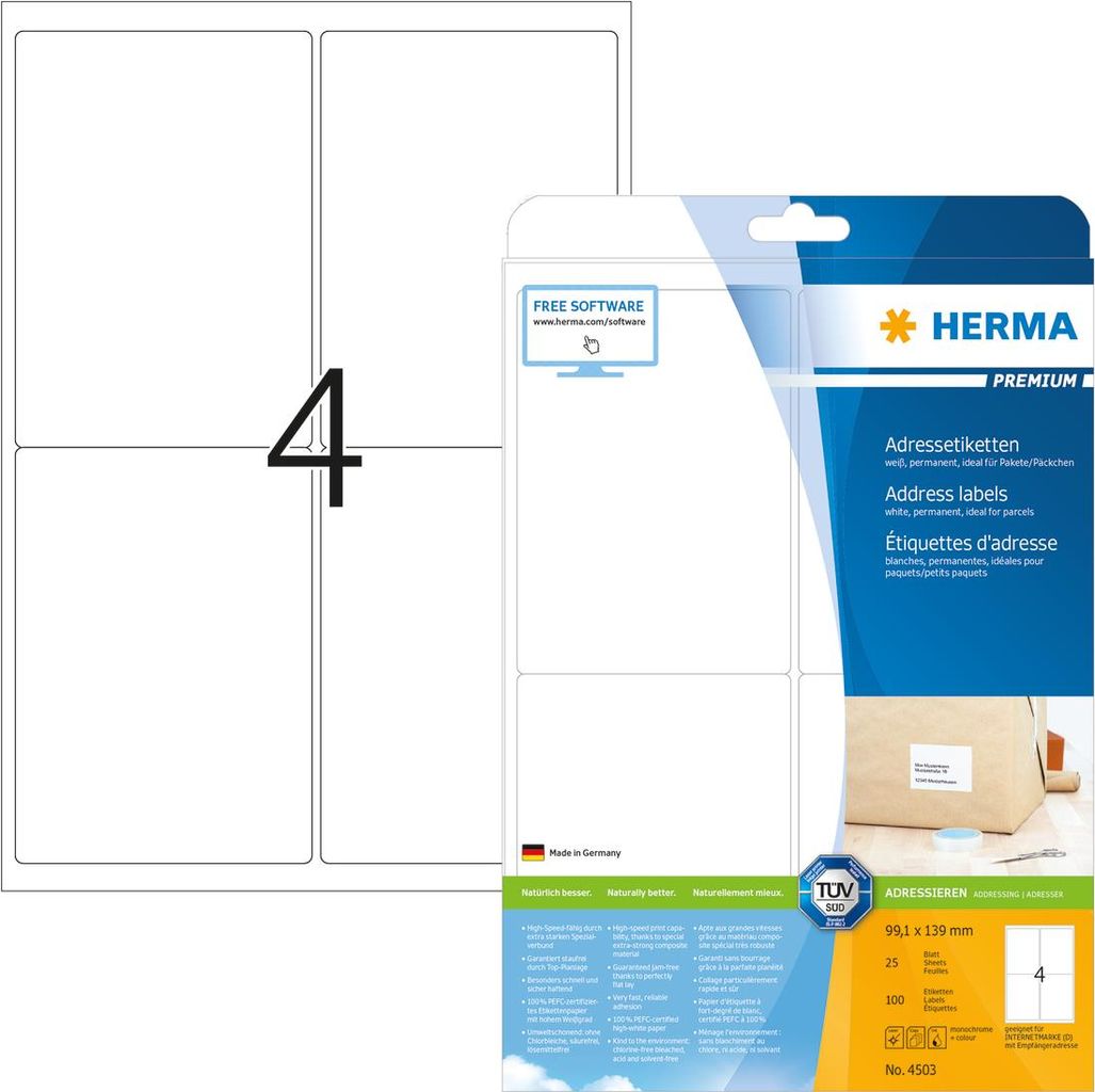 HERMA Premium - Selbstklebende Adressenetiketten - Mattes Weiß - 99,1 x 139 mm - 100 Etikett(en) (25 Bogen x 4) (4503)