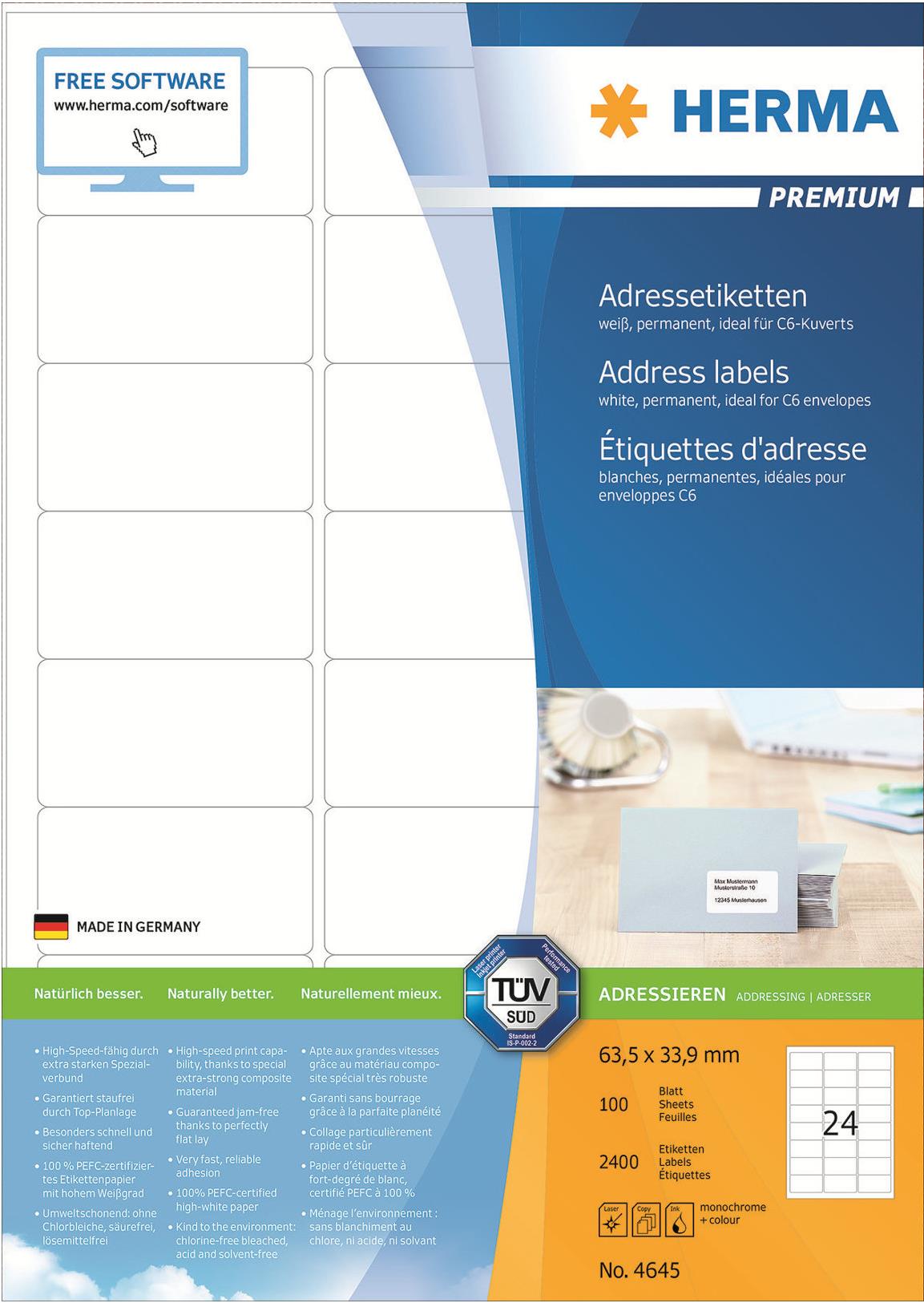 HERMA Premium - Papier - matt - permanent selbstklebend - weiß - 63.5 x 33.9 mm 2400 Etikett(en) (100 Bogen x 24) laminierte Adressetiketten