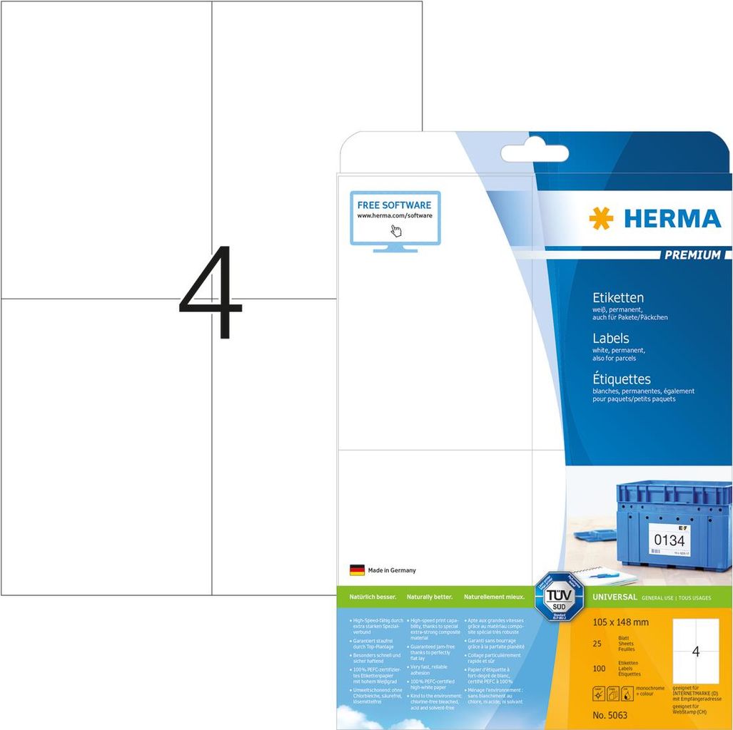 Selbstklebende Etiketten auf A4-Blättern, permanent haftend. Perfekt für alle Laser- und Inkjetdrucker, Kopierer, Farblaserdrucker und Farbkopierer. Garantiert staufrei und high-speed-fähig durch extra starken Spezialverbund, Top-Planlage und Rundum-Sicherheitskante. Problemloser Druckerdurchlauf für Laserdrucker und Inkjetdrucker getestet und bestätigt durch den TÜV SÜD. Hoher Weißgrad und gleichmäßige Oberfläche für beste Druckergebnisse in Schwarz und Farbe. Spürbar dicker: extra starke Etiketten - einfaches Aufkleben. Besonders schnell und sicher haftend, auch auf kühlen und feuchten Oberflächen. Umweltschonend und nachhaltig: chlorfrei gebleicht, PEFC-zertifiziert, lösemittelfreier Haftkleber. Etiketten sind 100 % recyclingfähig mit dem Altpapier, Verpackung aus Recyclingkarton. Kostenlose Softwarelösungen: www.herma.de/software.
