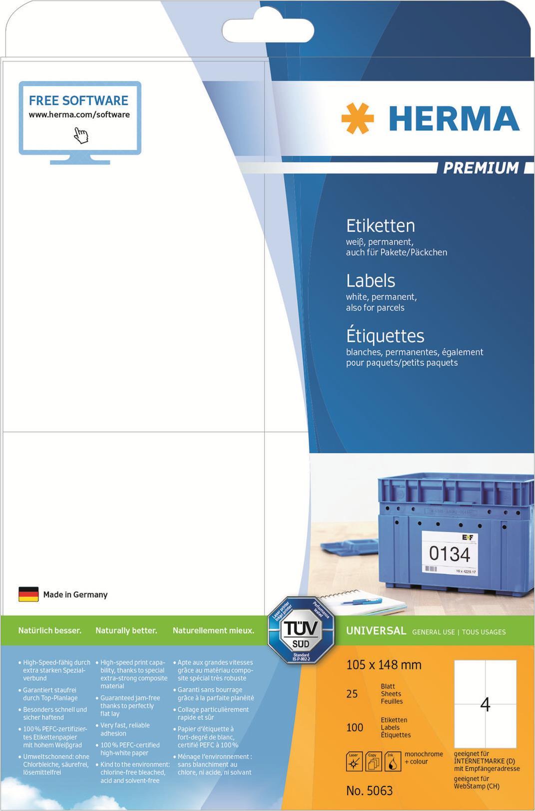 HERMA Premium - Permanent selbstklebende, matte laminierte Papieretiketten - weiß - 148 x 105 mm - 100 Etikett(en) (25 Bogen x 4) (5063)
