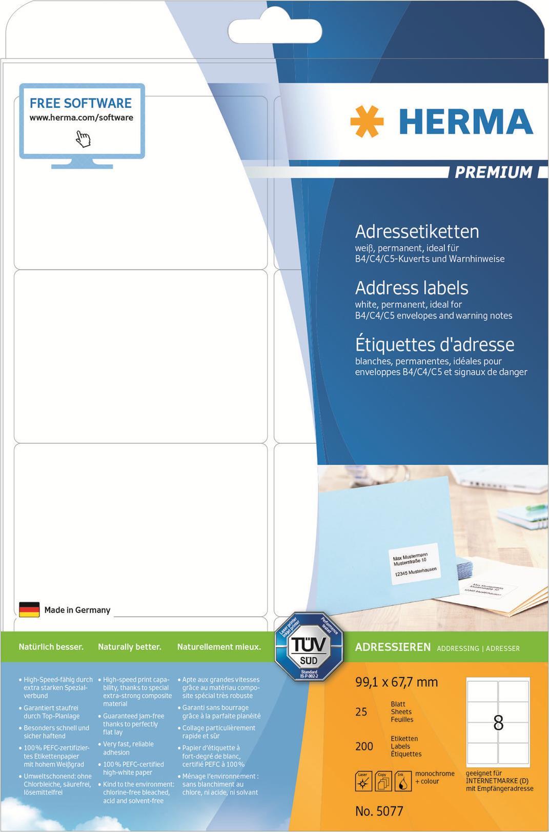 HERMA Premium - Permanent selbstklebende, matte laminierte Adressetiketten aus Papier - weiß - 99,1 x 67,7 mm - 200 Etikett(en) (25 Bogen x 8) (5077)