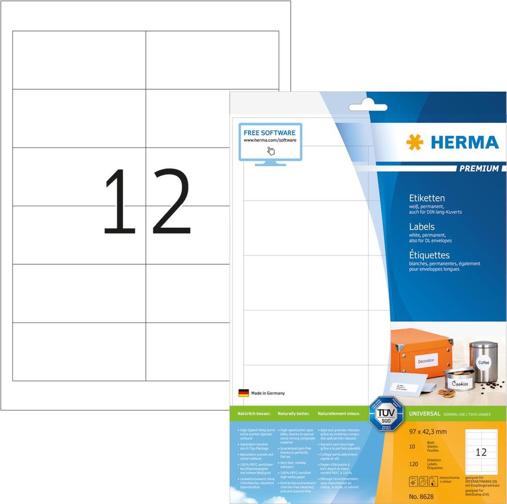 Selbstklebende Etiketten auf A4-Blättern, permanent haftend. Perfekt für alle Laser- und Inkjetdrucker, Kopierer, Farblaserdrucker und Farbkopierer. Garantiert staufrei und high-speed-fähig durch extra starken Spezialverbund, Top-Planlage und Rundum-Sicherheitskante. Problemloser Druckerdurchlauf für Laserdrucker und Inkjetdrucker getestet und bestätigt durch den TÜV SÜD. Hoher Weißgrad und gleichmäßige Oberfläche für beste Druckergebnisse in Schwarz und Farbe. Spürbar dicker: extra starke Etiketten - einfaches Aufkleben. Besonders schnell und sicher haftend, auch auf kühlen und feuchten Oberflächen. Umweltschonend und nachhaltig: chlorfrei gebleicht, PEFC-zertifiziert, lösemittelfreier Haftkleber. Etiketten sind 100 % recyclingfähig mit dem Altpapier, Verpackung aus Recyclingkarton. Kostenlose Softwarelösungen: www.herma.de/software.