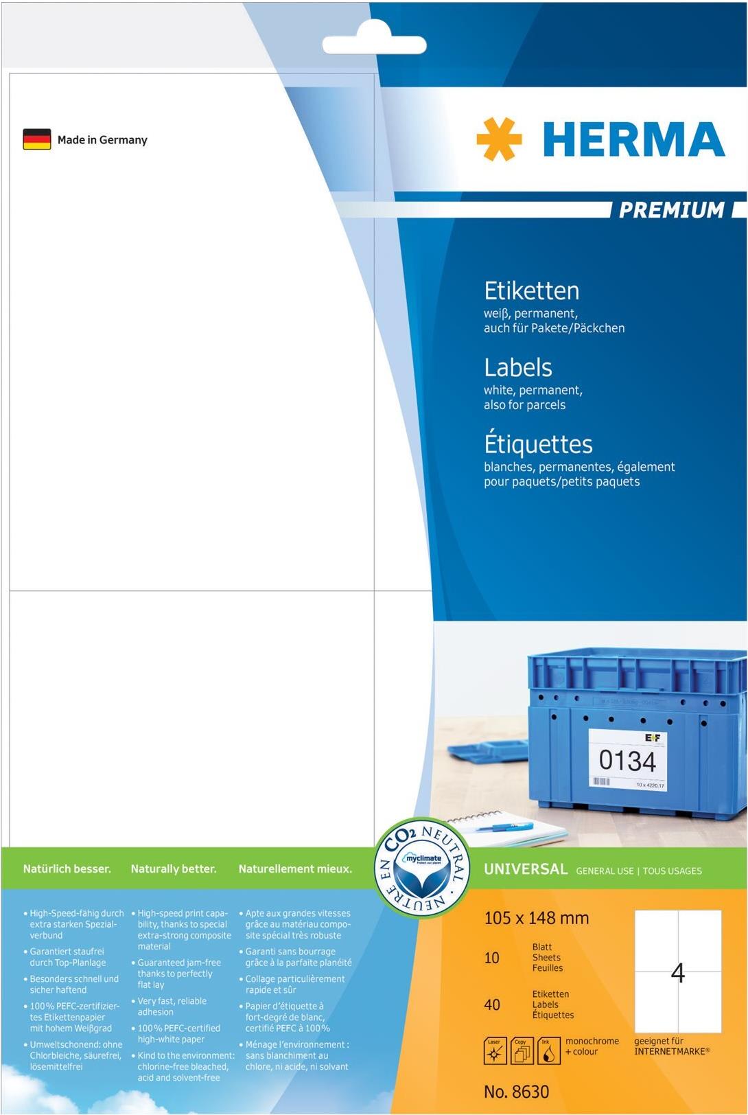 HERMA Premium - Permanent selbstklebende, matte laminierte Papieretiketten - weiß - 105 x 148 mm 40 Etikett(en) (10 Bogen x 4) (8630)