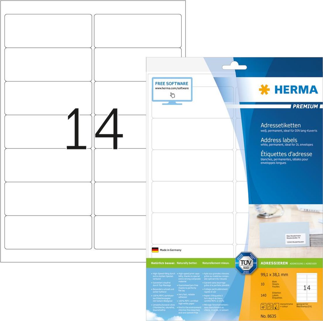 HERMA Premium - Permanent selbstklebende, matte laminierte Adressetiketten aus Papier - weiß - 99,1 x 38,1 mm 140 Etikett(en) (10 Bogen x 14) (8635)