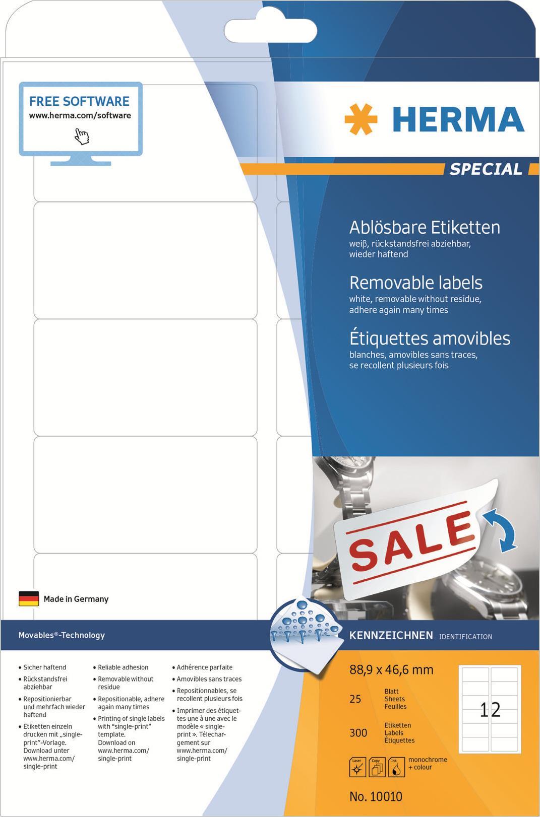 HERMA Special - Self-adhesive removable matte paper labels - weiß - 88,9 x 46,6 mm - 300 Etikett(en) (25 Bogen x 12) (10010)