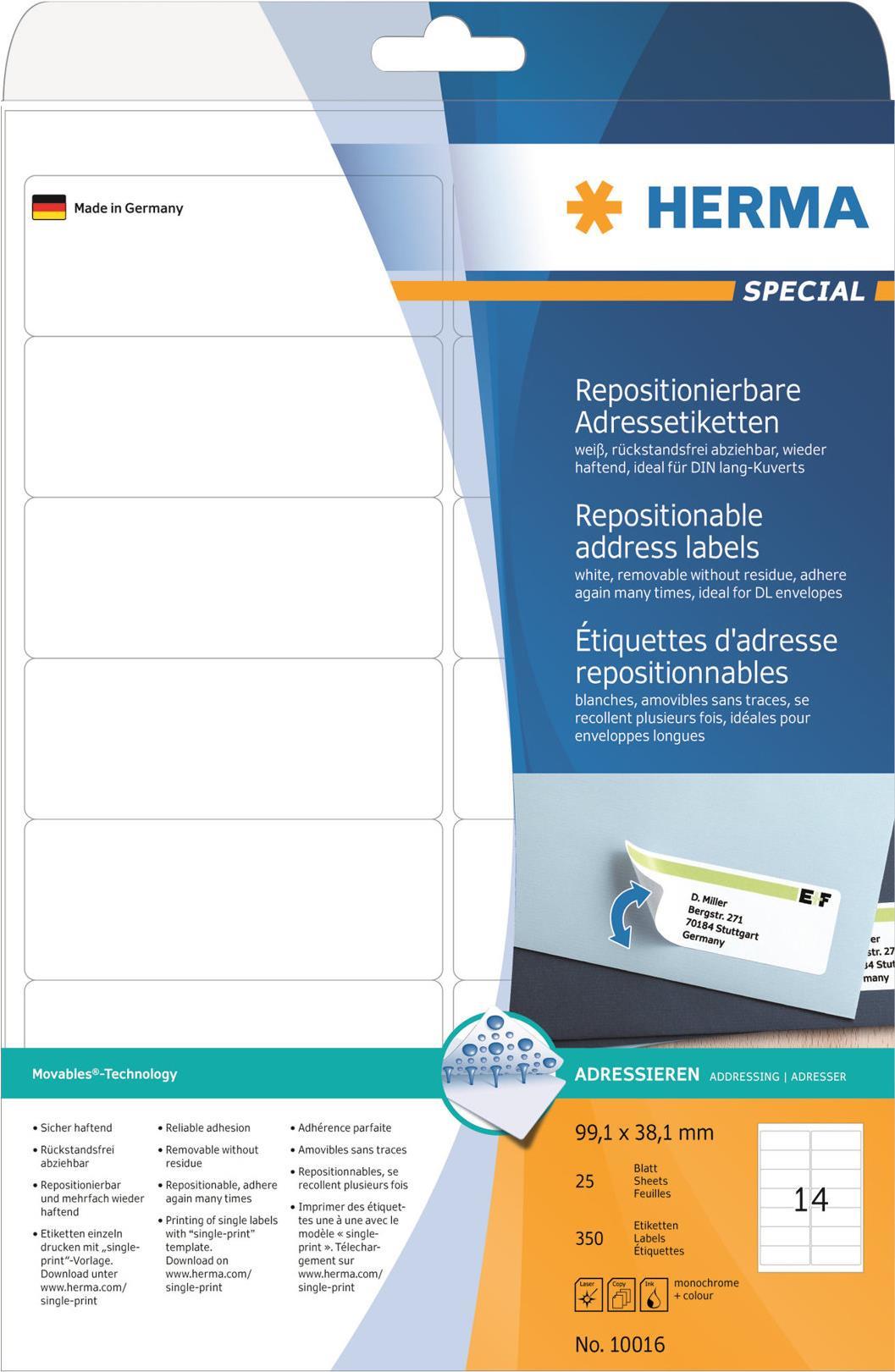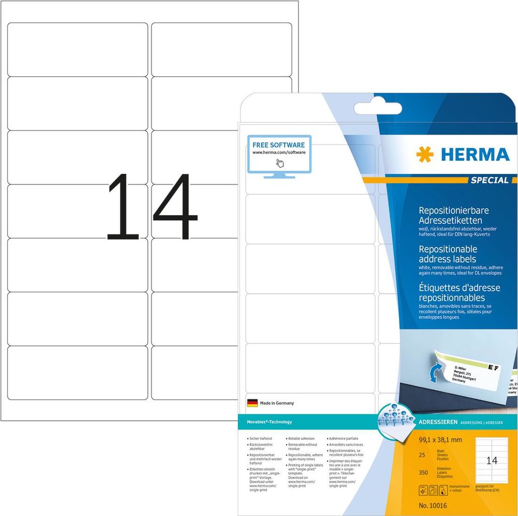 HERMA Special - Wiederverwendbare, selbstklebende, matte Adressetiketten aus Papier - weiß - 99,1 x 38,1 mm - 350 Etikett(en) (25 Bogen x 14) (10016)