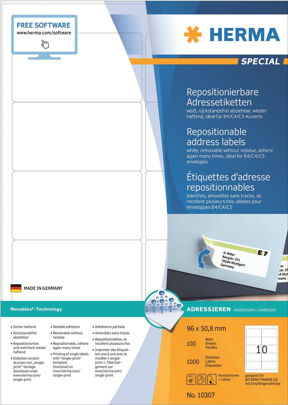 HERMA Special - Wiederverwendbare, selbstklebende, matte Adressetiketten aus Papier - weiß - 96 x 50,8 mm - 1000 Etikett(en) (100 Bogen x 10) (10307)