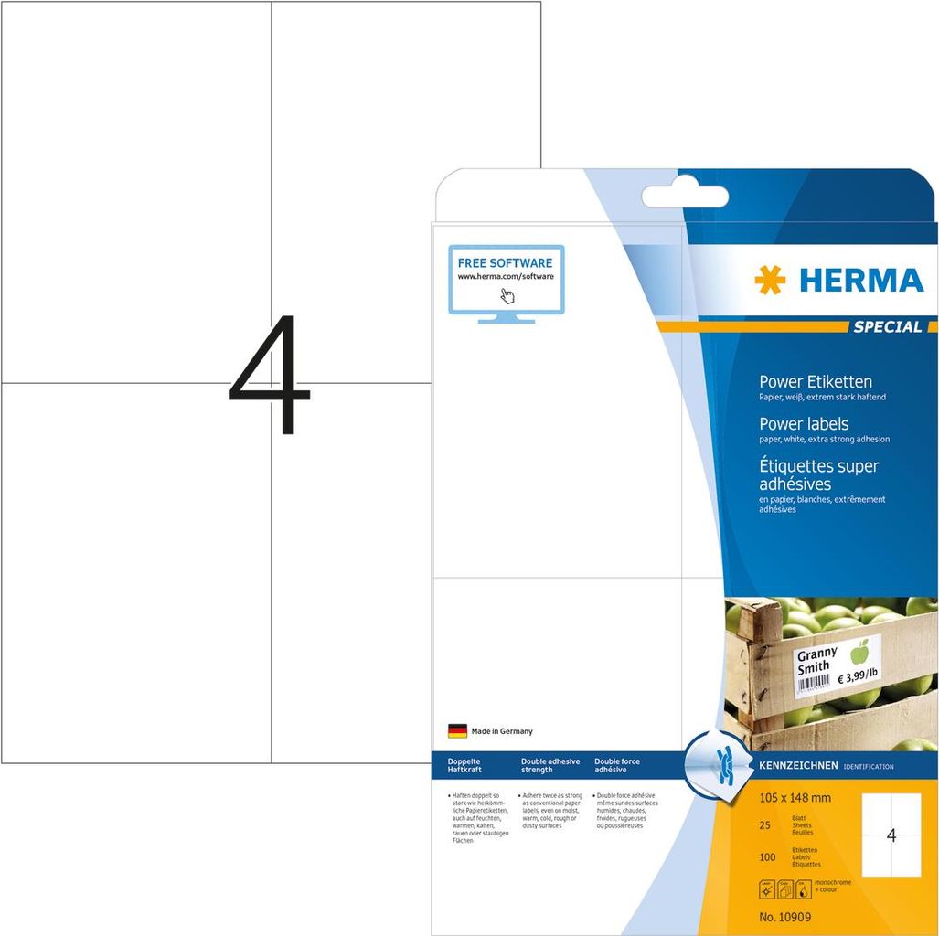 Extrem stark haftende Etiketten auf A4-Blättern, selbstklebend. Haften doppelt so stark wie herkömmliche Papieretiketten, auch auf kritischem Untergrund, z. B. feuchten, warmen, kalten, rauen oder staubigen Flächen. Ideal zur sicheren Kennzeichnung von Produkten, Dokumenten und Inventar, für Sicherheits- und Warnhinweise, für Rundbeklebung, als Prüfplakette oder Verschlussetikett, im Innenbereich. Umweltfreundlich: hochwertiges, chlorfrei gebleichtes Spezialpapier, PEFC-zertifiziert, lösemittelfreier Haftkleber. Etiketten sind 100 % recyclingfähig mit dem Altpapier, Verpackung aus Recyclingkarton. Sehr gute Druckergebnisse auf allen Laser- und Inkjetdruckern, Kopierern, Farblaserdruckern und Farbkopierern. Störungsfreie Verarbeitung durch Rundum-Sicherheitskante und optimale Planlage. Kostenlose Softwarelösungen: www.herma.de/software.