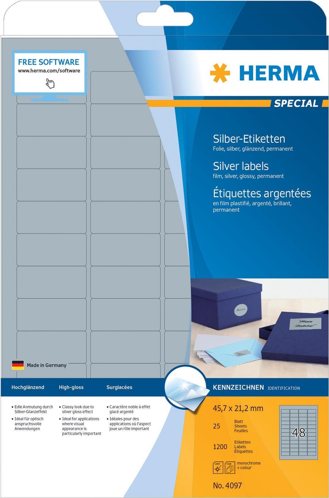 HERMA Special - Permanent self-adhesive glossy polyester film labels - Silber - 45,7 x 21,2 mm - 1200 Etikett(en) (25 Bogen x 48) (4097)