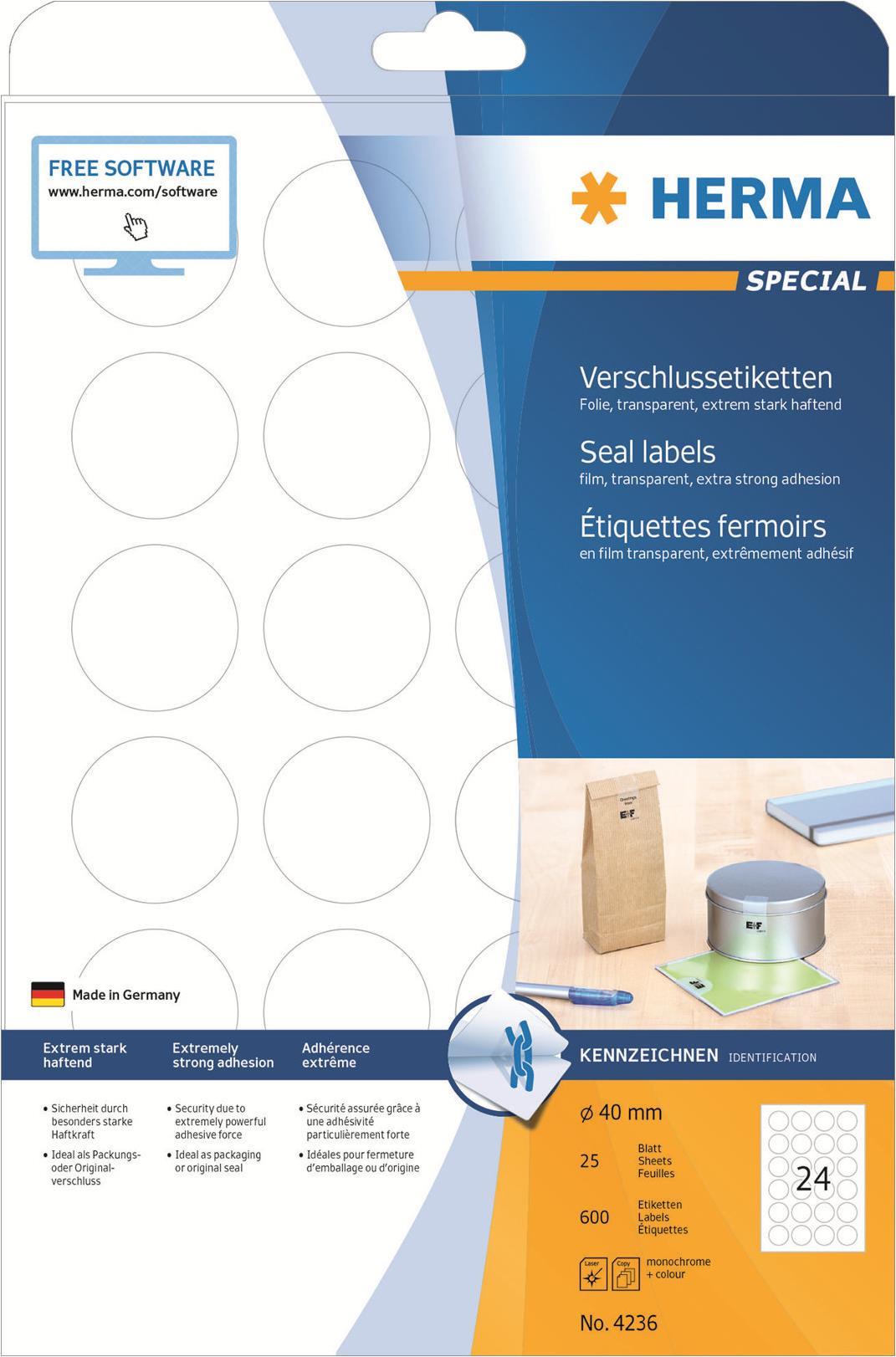 HERMA Special - Selbstklebende Sicherheits-/Siegelpolyesteretiketten - durchsichtig - 40 mm rund - 600 Etikett(en) (25 Bogen x 24) (4236)