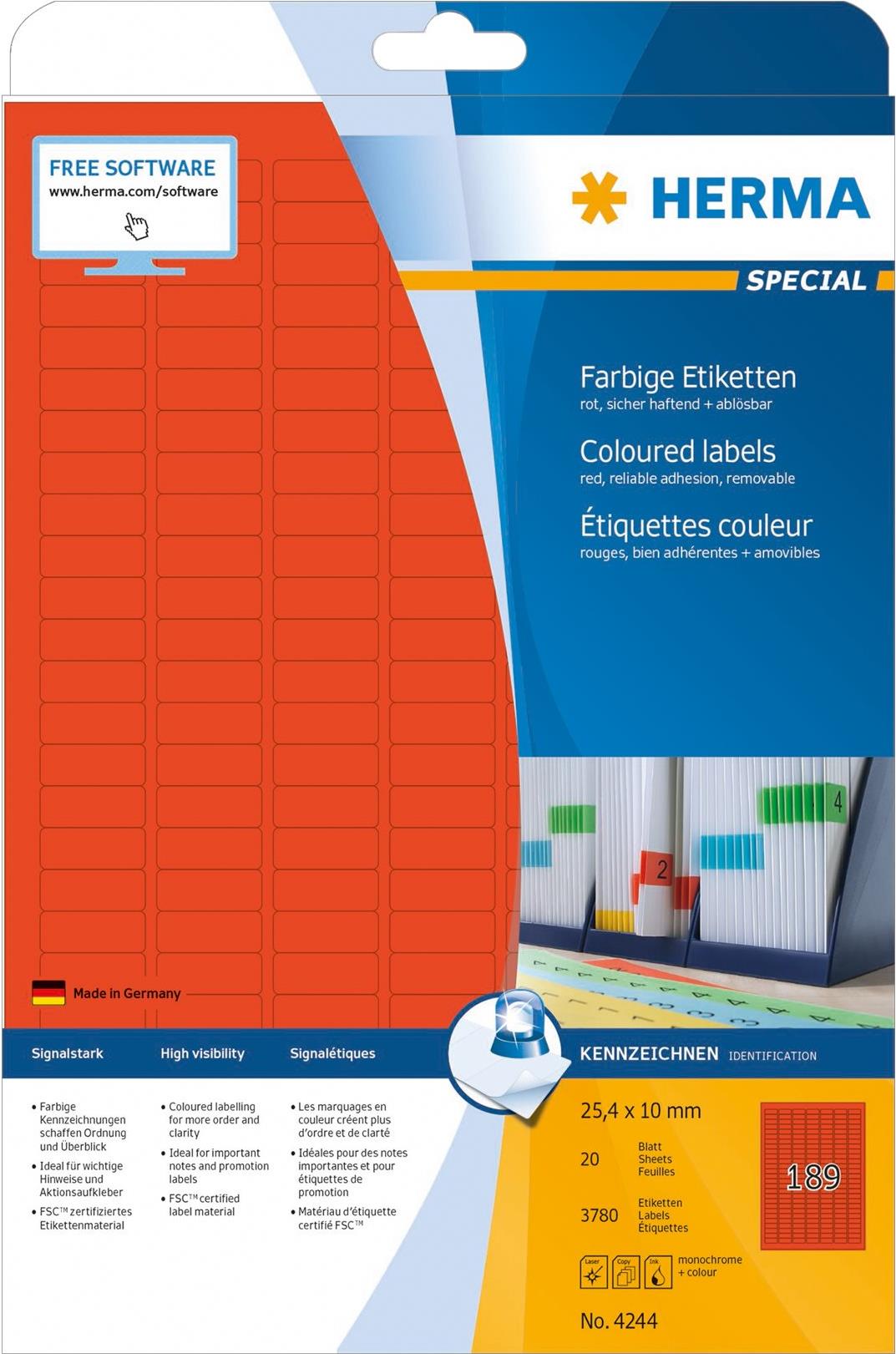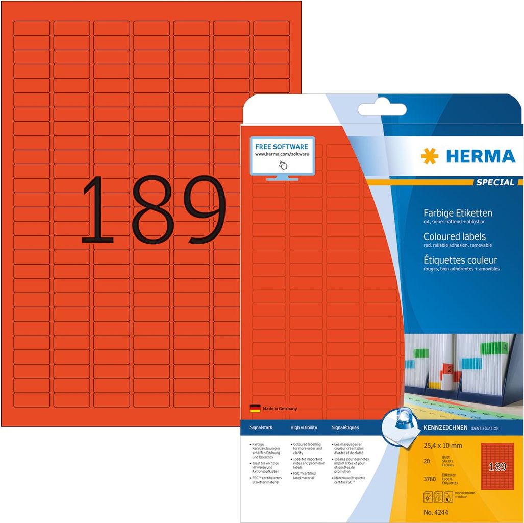 Farbige Etiketten auf A4-Blättern, selbstklebend. Ideal für Kennzeichnungen mit Signalcharakter, z. B. Warnhinweise, Eilvermerke, Adressänderungen, Farbcodierung, Aktionen,... Umweltfreundlich: FSC Mix Credit-zertifiziertes Etikettenpapier, chlorfrei gebleicht, lösemittelfreier Haftkleber. Etiketten sind 100 % recyclingfähig mit dem Altpapier, Verpackung aus Recyclingkarton. Sehr gute Druckergebnisse auf allen Laser- und Inkjetdruckern, Kopierern, Farblaserdruckern und Farbkopierern. Störungsfreie Verarbeitung durch Rundum-Sicherheitskante und optimale Planlage. Kostenlose Softwarelösungen: www.herma.de/software.