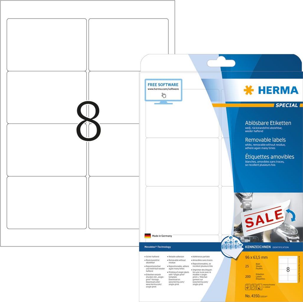 HERMA Special - Selbstklebende, abziehbare, matte Papieretiketten - weiß - 96 x 63,5 mm - 200 Etikett(en) (25 Bogen x 8) (4350)