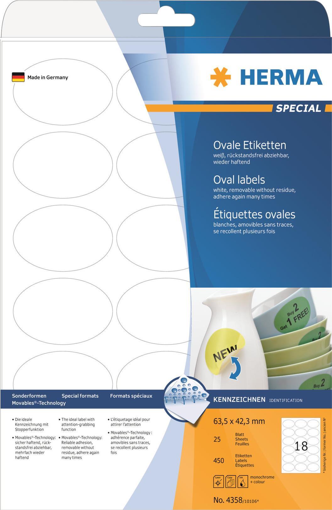 HERMA Special - Self-adhesive removable matte paper labels - weiß - 63,5 x 42,3 mm (oval) - 450 Etikett(en) (25 Bogen x 18) (4358)