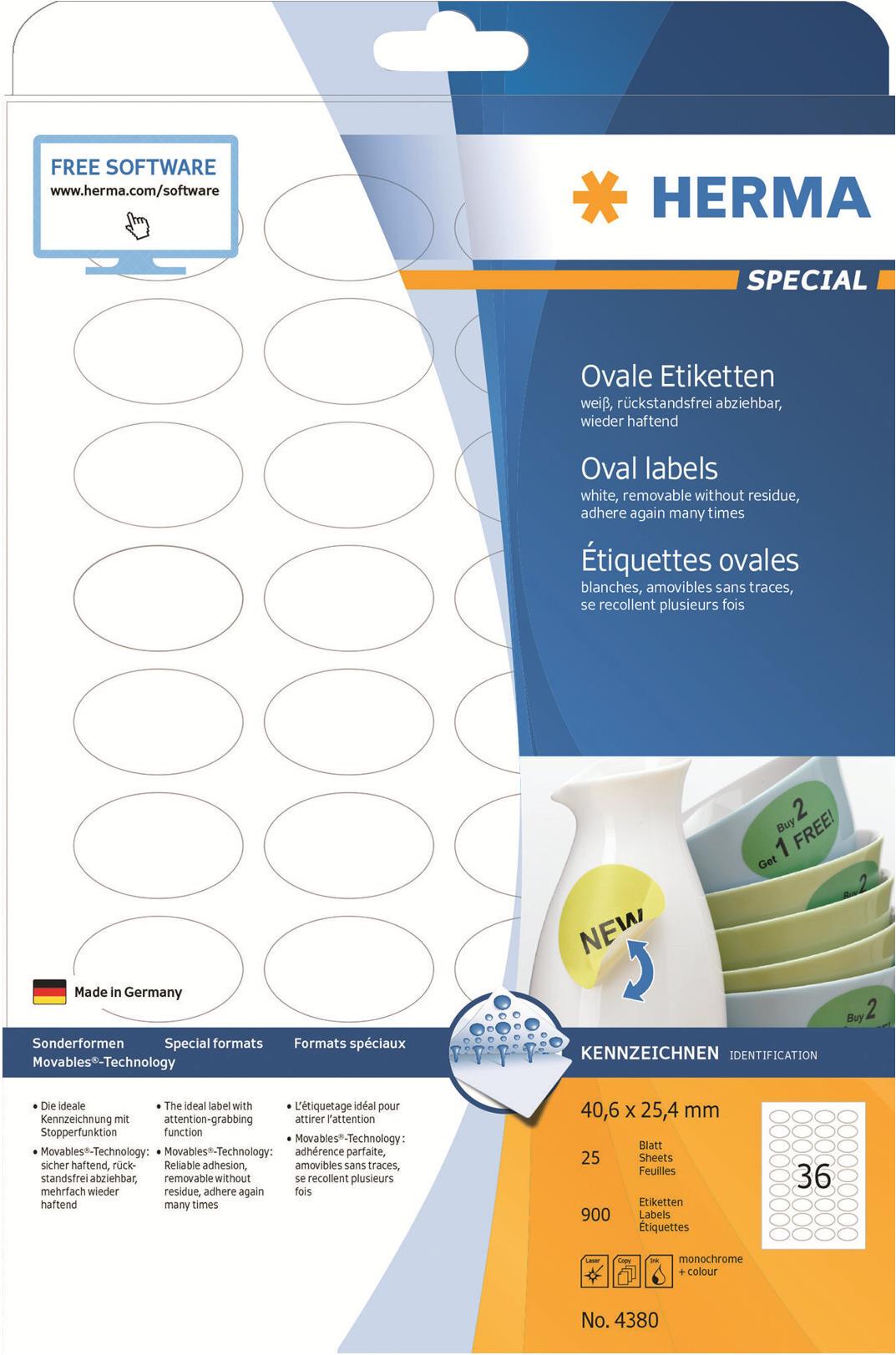 HERMA Special - Self-adhesive removable matte paper labels - weiß - 40,6 x 25,4 mm (oval) - 900 Etikett(en) (25 Bogen x 36) (4380)
