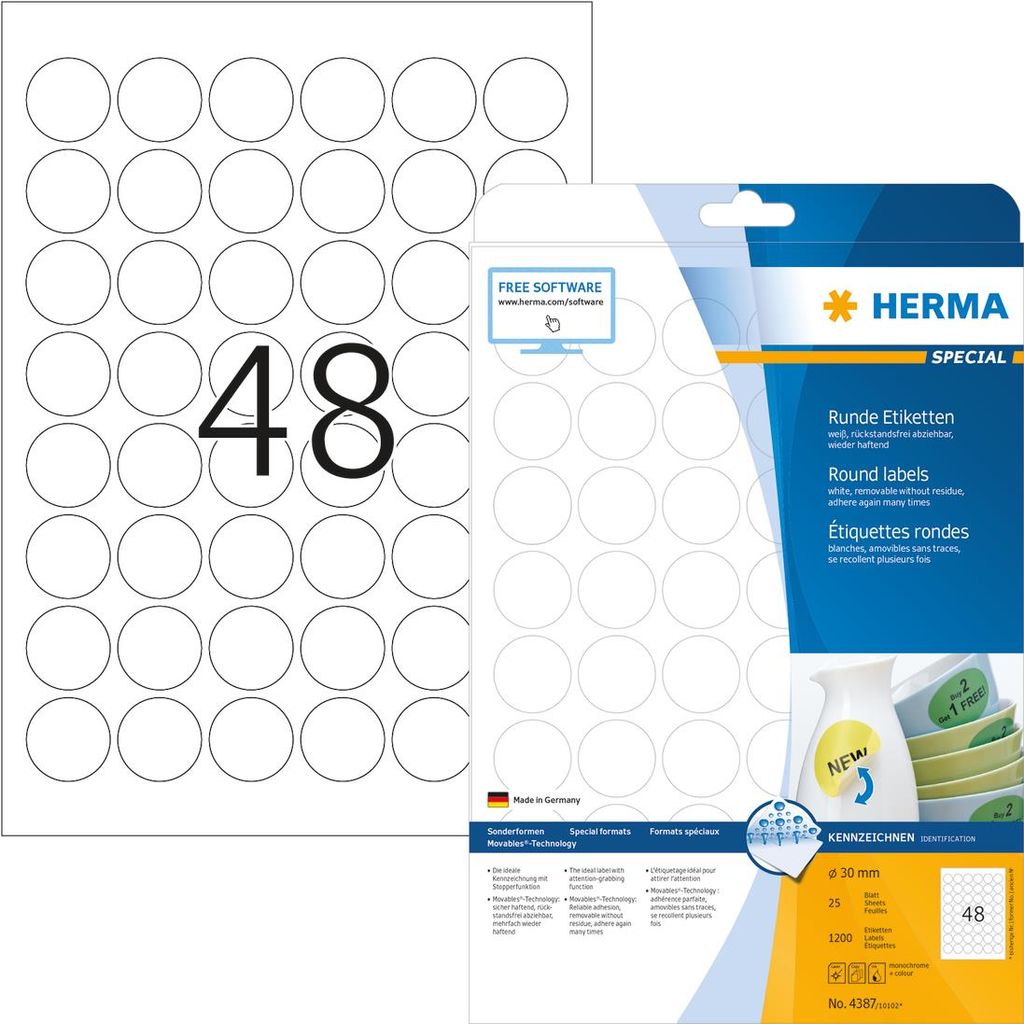 Selbstklebende Etiketten in rund, oval und quadratisch, auf A4-Blättern. Mit Movables -Technology: sicher haftend auf allen glatten, trockenen, unbeschädigten und staubfreien Flächen, rückstandsfrei wieder abziehbar ohne den Untergrund zu beschädigen, problemlos repositionierbar und mehrfach wieder haftend. Ideal zur flexiblen Beschriftung, für zeitlich befristete oder wechselnde Kennzeichnungen und Oberflächen, die nicht beschädigt werden sollen. Sehr gute Druckergebnisse auf allen Laser- und Inkjetdruckern, Kopierern, Farblaserdruckern und Farbkopierern. Störungsfreie Verarbeitung durch Rundum-Sicherheitskante und optimale Planlage. Umweltfreundlich: FSC Mix Credit-zertifiziert, chlorfrei gebleicht, lösemittelfreier Haftkleber. Etiketten sind 100 % recyclingfähig mit dem Altpapier, Verpackung aus Recyclingkarton. Kostenlose Softwarelösungen: www.herma.de/software.