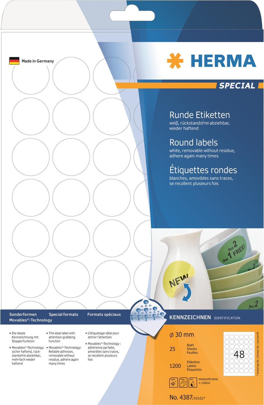 HERMA Special - Self-adhesive removable matte paper labels - weiß - 30 mm rund - 1200 Etikett(en) (25 Bogen x 48) (4387)