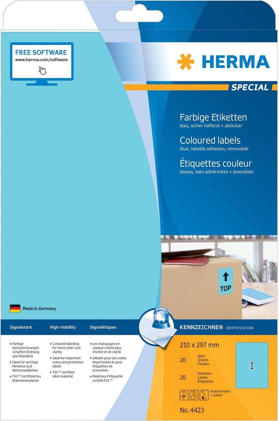 HERMA Special - Permanent self-adhesive matte paper labels - Blau - A4 (210 x 297 mm) - 20 Etikett(en) (20 Bogen x 1) (4423)