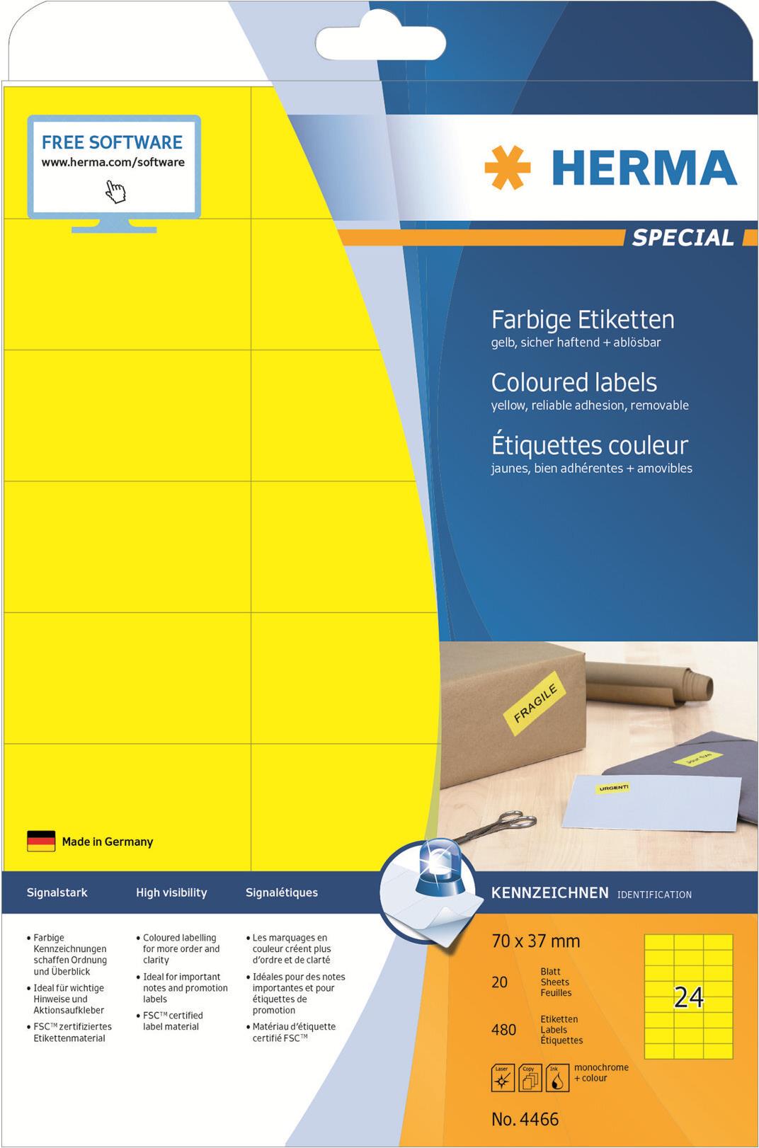 Farbige Etiketten auf A4-Blättern, selbstklebend. Ideal für Kennzeichnungen mit Signalcharakter, z. B. Warnhinweise, Eilvermerke, Adressänderungen, Farbcodierung, Aktionen,... Umweltfreundlich: FSC Mix Credit-zertifiziertes Etikettenpapier, chlorfrei gebleicht, lösemittelfreier Haftkleber. Etiketten sind 100 % recyclingfähig mit dem Altpapier, Verpackung aus Recyclingkarton. Sehr gute Druckergebnisse auf allen Laser- und Inkjetdruckern, Kopierern, Farblaserdruckern und Farbkopierern. Störungsfreie Verarbeitung durch Rundum-Sicherheitskante und optimale Planlage. Kostenlose Softwarelösungen: www.herma.de/software.