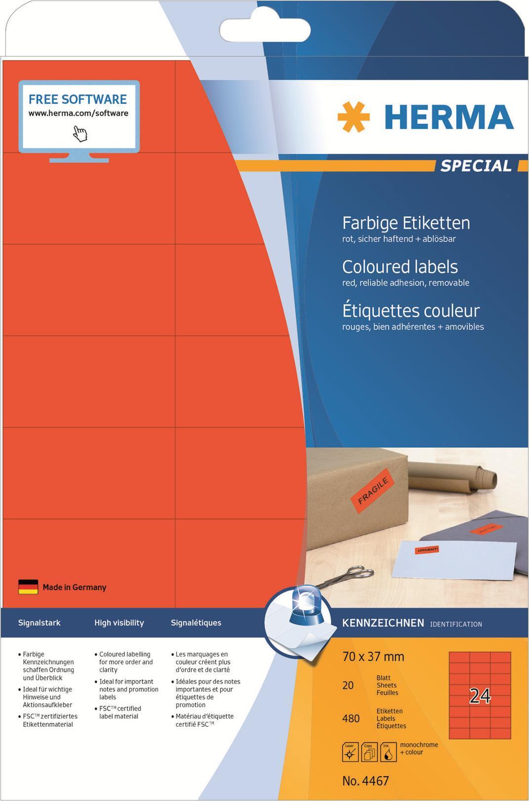 Farbige Etiketten auf A4-Blättern, selbstklebend. Ideal für Kennzeichnungen mit Signalcharakter, z. B. Warnhinweise, Eilvermerke, Adressänderungen, Farbcodierung, Aktionen,... Umweltfreundlich: FSC Mix Credit-zertifiziertes Etikettenpapier, chlorfrei gebleicht, lösemittelfreier Haftkleber. Etiketten sind 100 % recyclingfähig mit dem Altpapier, Verpackung aus Recyclingkarton. Sehr gute Druckergebnisse auf allen Laser- und Inkjetdruckern, Kopierern, Farblaserdruckern und Farbkopierern. Störungsfreie Verarbeitung durch Rundum-Sicherheitskante und optimale Planlage. Kostenlose Softwarelösungen: www.herma.de/software.