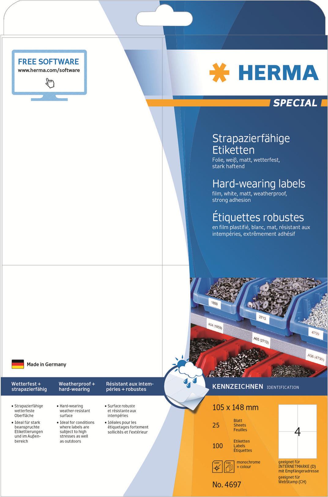 HERMA Special - Selbstklebende, wetterbeständige, matte Folienetiketten für den Außenbereich - weiß - 105 x 148 mm - 100 Etikett(en) (25 Bogen x 4) (4697)