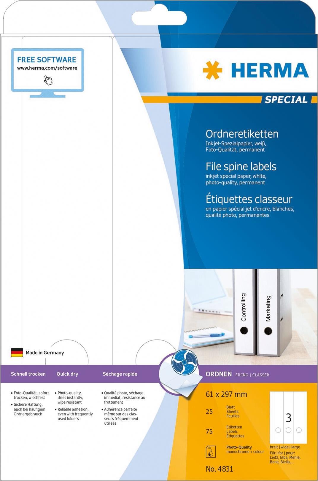 Ordneretiketten auf A4-Blättern, selbstklebend. Hervorragende Inkjetdrucke in Schwarz und Farbe. Aus hochwertigem, gestrichenem Spezialpapier, 90 g/m für konturenscharfe und farbbrillante Drucke in Foto-Qualität. Blanko: Ideal für Firmenlogo, Beschriftungen und Ordnungsvermerke. Sicher haftend, auch bei häufiger Verwendung des Ordners. Mit umlaufendem Rand: vollflächig bedruckbar und ideal auch für Inkjetdrucker mit kritischen Papierführungen. Kostenlose Softwarelösungen: www.herma.de/software.