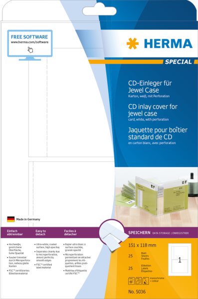 CD- und DVD-Einleger aus Karton, nicht klebend. So passt die Hülle perfekt zum Etikett - professionelle Optik für jede CD oder DVD. Deckel- und Rückeneinleger auf einem Blatt, in einem Druckvorgang bedrucken - fertig. Hochweißer, gestrichener Spezialkarton mit hoher Deckkraft. Sauber trennbar durch Mikroperforation, nahezu glatte Kanten. Sehr gute Druckergebnisse auf allen Laserdruckern und Kopierern, Farblaserdruckern und Farbkopierern. Kostenlose Softwarelösungen: www.herma.de/software.