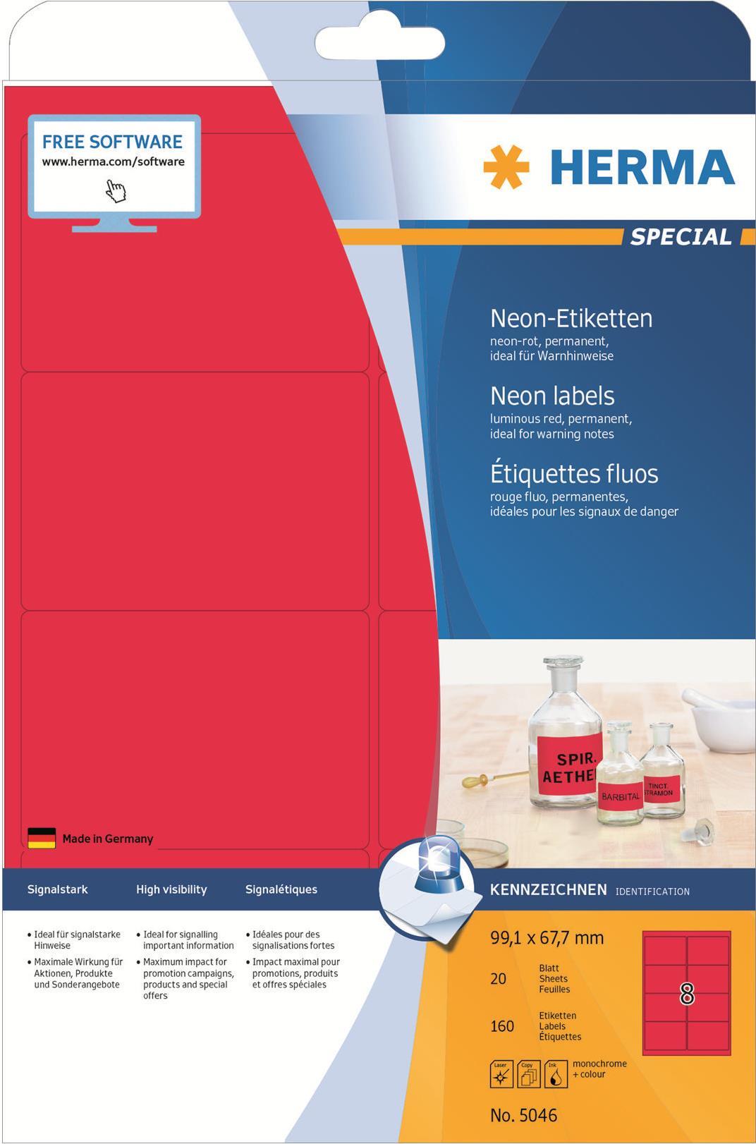 HERMA Special - Permanent selbstklebende, matte, fluoreszierende Papieretiketten - Luminous Red - 99,1 x 67,7 mm - 160 Etikett(en) (20 Bogen x 8) (5046)