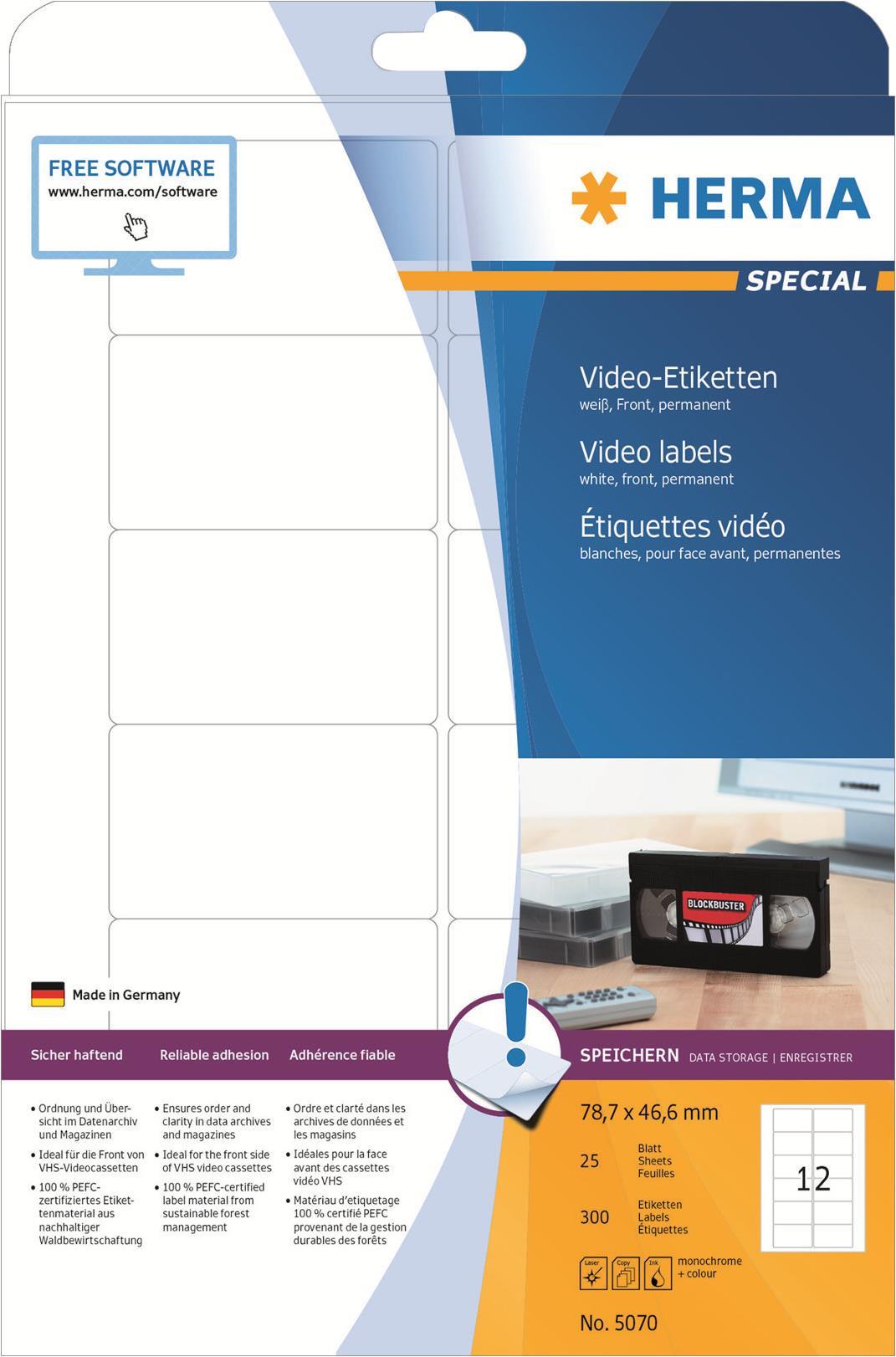 HERMA Special - Permanent selbstklebende, matte Papieretiketten für Videokassetten - weiß - 78,7 x 46,6 mm - 300 Etikett(en) (25 Bogen x 12) (5070)