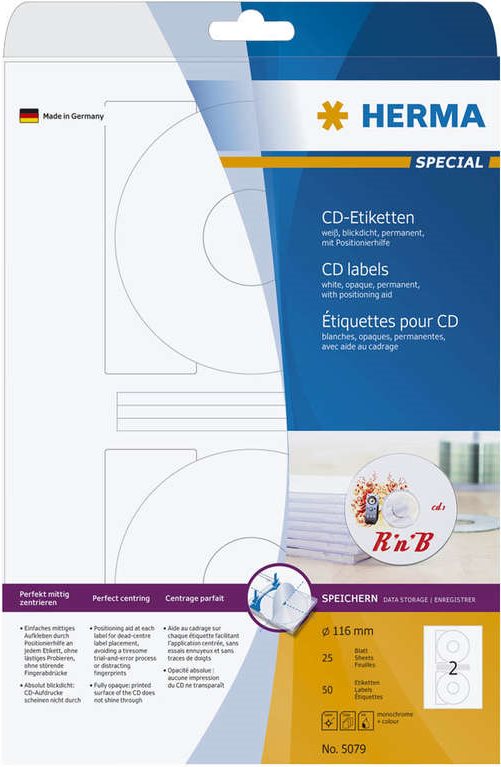 CD-Etiketten aus Papier, auf A4-Blättern, selbstklebend. Absolut blickdichtes Material mit hohem Weißgrad, CD-Aufdrucke scheinen nicht durch. Einfaches mittiges Aufkleben durch Positionierhilfe an jedem Etikett. Sichere Haftung, auch in High-Speed-Laufwerken. Umweltfreundlich: hochwertiges, chlorfrei gebleichtes Spezialpapier, PEFC-zertifiziert, lösemittelfreier Haftkleber, Verpackung aus Recyclingkarton. Sehr gute Druckergebnisse auf allen Laser- und Inkjetdruckern, Kopierern, Farblaserdruckern und Farbkopierern. Störungsfreie Verarbeitung durch Rundum-Sicherheitskante und optimale Planlage. Kostenlose Softwarelösungen: www.herma.de/software.