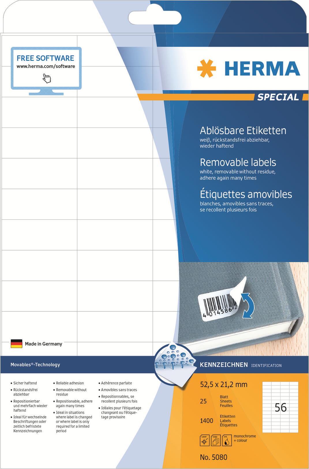 Selbstklebende Etiketten auf A4-Blättern. Mit Movables -Technology: sicher haftend auf allen glatten, trockenen, unbeschädigten und staubfreien Flächen, rückstandsfrei wieder abziehbar ohne den Untergrund zu beschädigen, problemlos repositionierbar und mehrfach wieder haftend. Ideal für zeitlich befristete oder wechselnde Kennzeichnungen und Oberflächen, die nicht beschädigt werden sollen. Sehr gute Druckergebnisse auf allen Laser- und Inkjetdruckern, Kopierern, Farblaserdruckern und Farbkopierern. Störungsfreie Verarbeitung durch Rundum-Sicherheitskante und optimale Planlage. Umweltfreundlich: FSC Mix Credit-zertifiziert, chlorfrei gebleicht, lösemittelfreier Haftkleber. Etiketten sind 100 % recyclingfähig mit dem Altpapier, Verpackung aus Recyclingkarton. Kostenlose Softwarelösungen: www.herma.de/software.