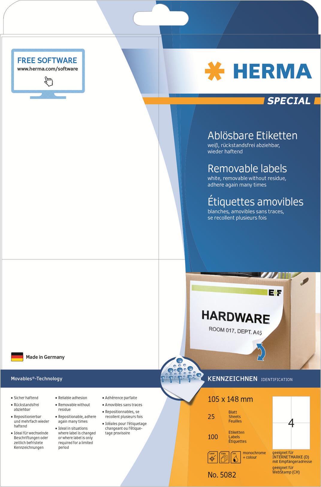 HERMA Special - Selbstklebende, abziehbare, matte Papieretiketten - weiß - 105 x 148 mm - 100 Etikett(en) (25 Bogen x 4) (5082)