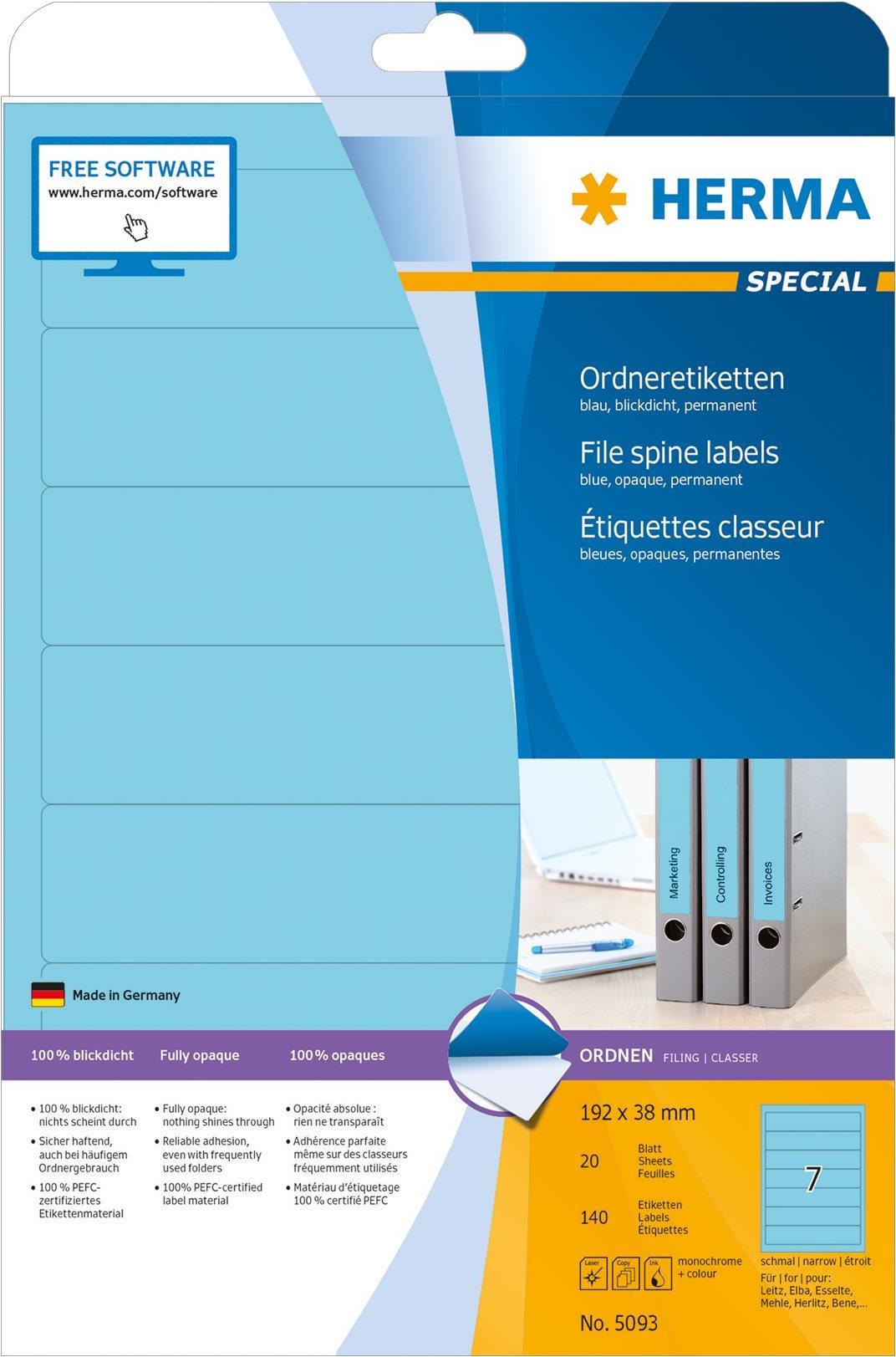HERMA Special - Permanent self-adhesive matte opaque file folder paper labels - Blau - 192 x 38 mm - 175 Etikett(en) (25 Bogen x 7) (5093)