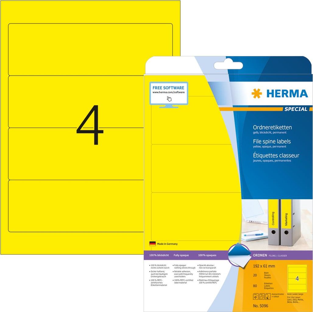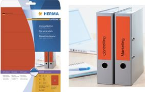 Ordneretiketten auf A4-Blättern, selbstklebend. Für ein einheitliches Erscheinungsbild im Büro und Zuhause. Für alle gängigen Ordner geeignet. Absolut blickdichtes Material, alte Ordnerbeschriftungen scheinen nicht durch. Blanko: Ideal für Firmenlogo, Beschriftungen und Ordnungsvermerke. Sicher haftend, auch bei häufigem Ordnergebrauch. Umweltfreundlich: hochwertiges, chlorfrei gebleichtes Spezialpapier, PEFC-zertifiziert, lösemittelfreier Haftkleber. Etiketten sind 100 % recyclingfähig mit dem Altpapier, Verpackung aus Recyclingkarton. Sehr gute Druckergebnisse auf allen Laser- und Inkjetdruckern, Kopierern, Farblaserdruckern und Farbkopierern. Störungsfreie Verarbeitung durch Rundum-Sicherheitskante und optimale Planlage. Kostenlose Softwarelösungen: www.herma.de/software.