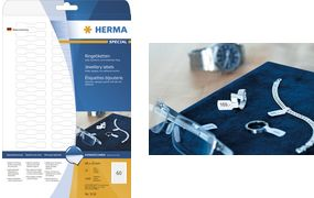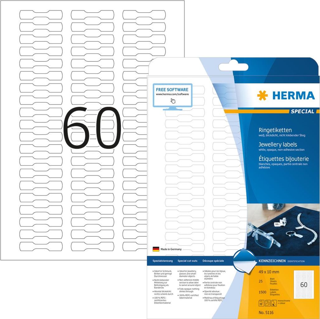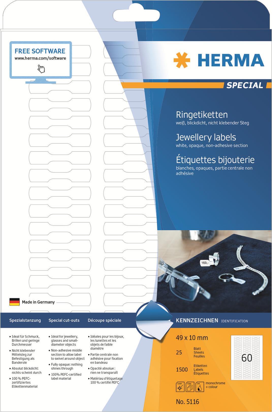 Blickdichte Ringetiketten aus Papier, auf A4-Blättern, selbstklebend, nicht klebender Mittelsteg. Zum Auszeichnen von Ringen, Uhren, Schmuck, Brillen und Gegenständen mit geringem Durchmesser, z. B. Kabel. Einfach die Klebeflächen zusammenkleben - fertig. Umweltfreundlich: hochwertiges, chlorfrei gebleichtes Spezialpapier, PEFC-zertifiziert, lösemittelfreier Haftkleber. Sehr gute Druckergebnisse auf allen Laser- und Inkjetdruckern, Kopierern, Farblaserdruckern und Farbkopierern. Störungsfreie Verarbeitung durch Rundum-Sicherheitskante und optimale Planlage. Kostenlose Softwarelösungen: www.herma.de/software.