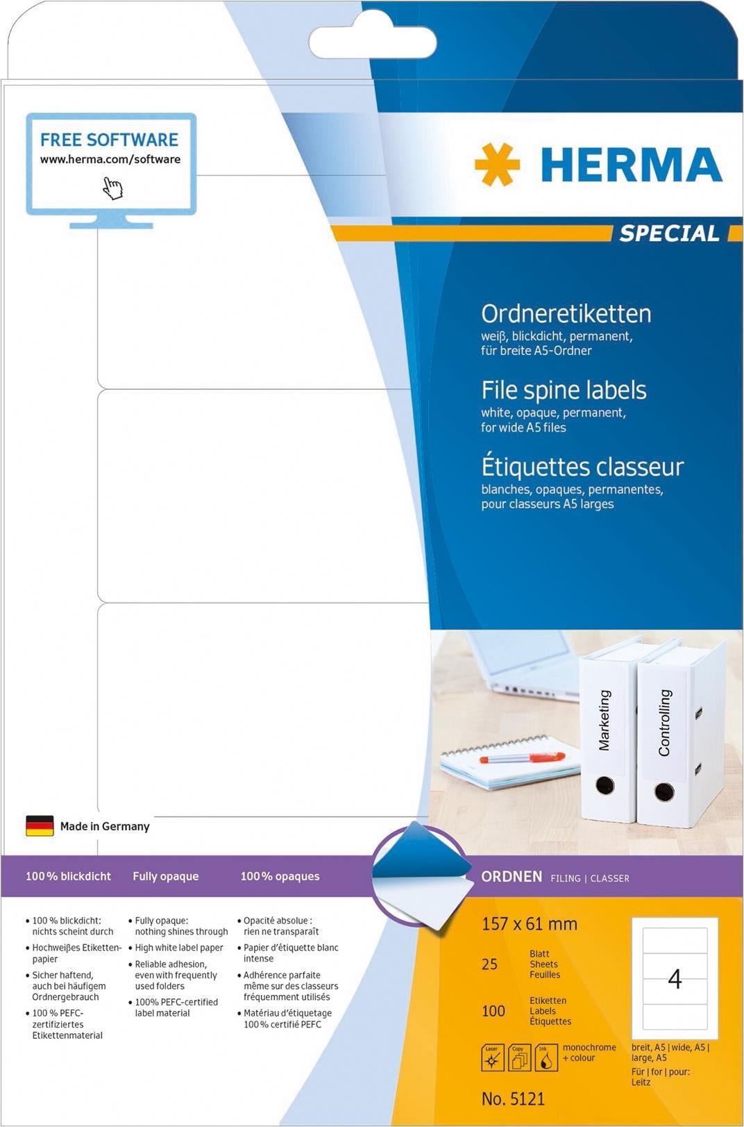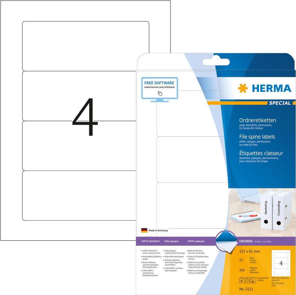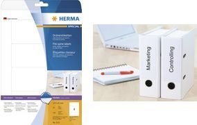 Ordneretiketten auf A4-Blättern, selbstklebend. Für ein einheitliches Erscheinungsbild im Büro und Zuhause. Für alle gängigen Ordner geeignet. Absolut blickdichtes Material mit hohem Weißgrad, alte Ordnerbeschriftungen scheinen nicht durch. Blanko: Ideal für Firmenlogo, Beschriftungen und Ordnungsvermerke. Sicher haftend, auch bei häufigem Ordnergebrauch. Umweltfreundlich: hochwertiges, chlorfrei gebleichtes Spezialpapier, PEFC-zertifiziert, lösemittelfreier Haftkleber. Etiketten sind 100 % recyclingfähig mit dem Altpapier, Verpackung aus Recyclingkarton. Sehr gute Druckergebnisse auf allen Laser- und Inkjetdruckern, Kopierern, Farblaserdruckern und Farbkopierern. Störungsfreie Verarbeitung durch Rundum-Sicherheitskante und optimale Planlage. Kostenlose Softwarelösungen: www.herma.de/software.