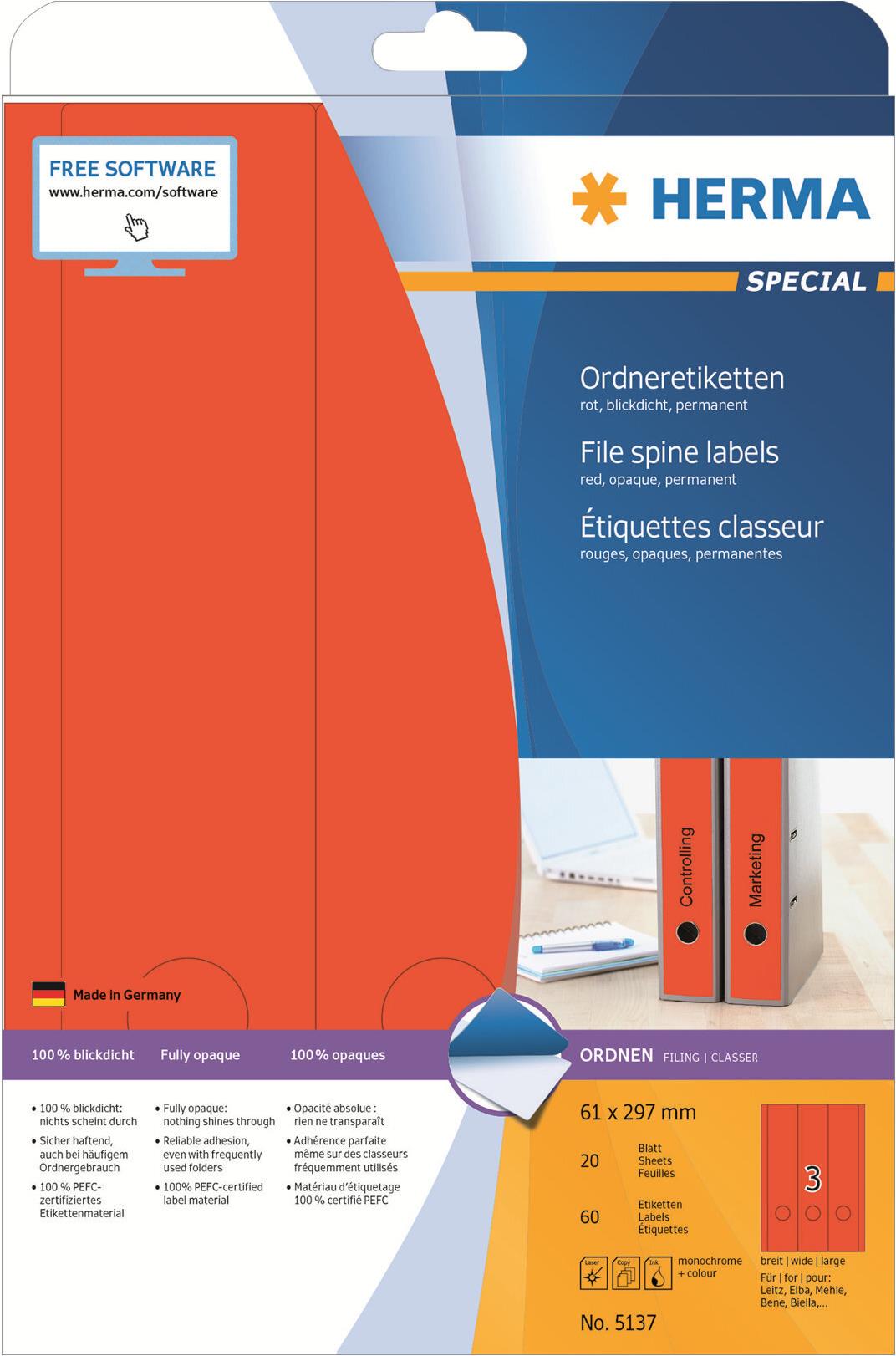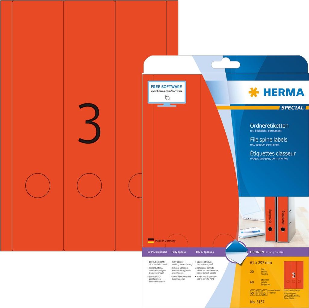 HERMA Special - Perforierte, permanent selbstklebende, lichtundurchlässige Aktenetiketten aus Papier - Rot - 61 x 297 mm - 60 Etikett(en) (25 Bogen x 3) (5137)